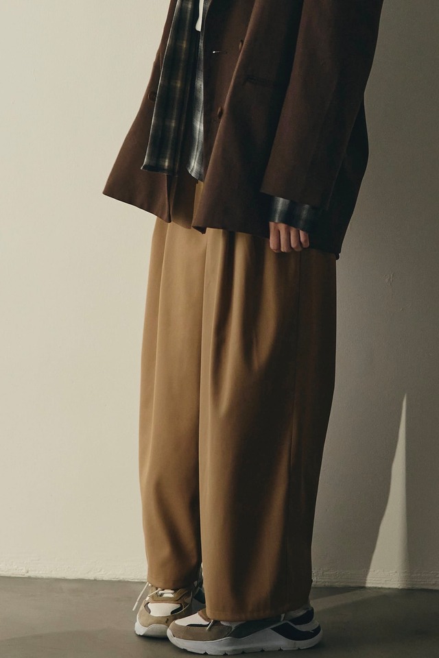 タックコクーンパンツ 【商品説明】 深めのタックがつくるやわらかなドレープが印象的なワイドパンツ。 さらりとした生地感で軽やかに穿けるのに、メンズスーツにも使われるしっかりとした素材を使用しているので、シルエットがきれいに決まります。 ウエストは後ろゴムでリラクシーな穿き心地。 シンプルなトップスを合わせるだけで、抜け感のある大人カジュアルスタイルに仕上がります。 きちんと感もありつつ、デイリーに頼れる一本です。 【カラー】 ベージュ / チャコール / ブラック 【素材】 ポリエステル 75% レーヨン 25% 【サイズ】 F 総丈103cm / ウエスト33~38cm / ヒップ46cm / わたり38cm / 裾巾27cm ◇手洗い可 ※ 製品の特性上、洗濯機のご使用はお控え下さい。 ※ タンブラー乾燥はお避け下さい。 ※ 洗濯により収縮やねじれ、型崩れすることがあるので、形を整えて干して下さい。 ※ 色移りの可能性があるため、薄い色の商品とは分けて洗ってください。 ※ 濡れたままの状態で擦れると、色移りすることがあります。着用中の摩擦や、汗、水濡れ 濃淡差があるものとの重ね着にご注意下さい。 ※ 洗剤や溶剤により付属部分が変色や剥げることがあります。包むなどでご注意下さい。 ※ アイロンは当て布を使用して下さい。 ※ 日光で変色や黄ばみが生じることがありますので、直射日光を避け、日陰干しにして下さい。 ※ この製品は独特の雰囲気を出す為に糸・素材の風合いを重視しています。そのため、洗濯時に斜行(ねじれ)が生じますが、他の製品では味わえない雰囲気をお楽み下さい。 ※ サイズは測り方により1~2㎝ほど誤差が生じる場合があります。 ※ 一度でも着用した場合は、基本的にいかなる理由があっても返品はお断りさせていただきますのでご了承下さい。 ※ イメージ違い、モニターとの色違いなどの、あらゆるお客様のご都合による注文キャンセル・返品・交換は一切応じられませんのでご了承下さい。 ※ 発送前でも、注文後のキャンセルはお受けできませんのでご了承下さい。 ※ 初期不良の交換につきましては、商品到着後5日以内にご連絡下さい。5日を過ぎますと、返品・交換はお受けできませんのでご了承下さい。 ※ 商品の付属品を紛失された場合は、いかなる不良がありましても返品・交換はお受けできませんのでご了承下さい。 ※ 納期の違う商品を複数枚お買い上げの場合、納期が一番遅い商品に合わせての発送となります。(別々での発送は出来ません) 上記ご了承の上、ご注文をお願い致します。 52011