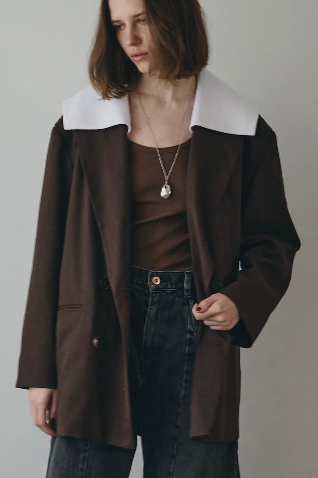 クレリックジャケット 【商品説明】 取り外し可能な白襟をあしらった、ダブルブレストのクレリックジャケット。 クラシカルなムードを宿しながらも、程よくルーズなシルエットでモードな抜け感をプラス。 白襟を外すと、マニッシュなテーラードジャケットとしても着用でき、 シーンや気分に合わせて印象を変えられるデザインです。 シンプルな中に存在感を宿した、今季らしいレイヤードスタイルを楽しめる一着。 【カラー】 ブラウン / チャコール 【素材】 表地 ポリエステル 75% レーヨン 24% ポリウレタン 1% 襟部分 ポリエステル 100% 【サイズ】 F 着丈68cm / 身幅58cm / 肩巾48cm / 袖丈55cm / 裾巾56cm ◇手洗い不可 プロフェッショナルクリーニングをお勧めします。 必ず衿部分は取り外して別でクリーニングしてください。 (製品の特性上、ご自宅でのセルフクリーニングはお控え下さい) ※ 製品の特性上、洗濯機のご使用はお控え下さい。 ※ タンブラー乾燥はお避け下さい。 ※ 濃色品は色落ちする恐れがありますので、単独で洗って下さい。 ※ 濡れたままの状態で擦れると、色移りすることがあります。着用中の摩擦や、汗、水濡れ 濃淡差があるものとの重ね着にご注意下さい。 ※ 洗剤や溶剤により付属部分が変色や剥げることがあります。包むなどでご注意下さい。 ※ アイロンは当て布を使用して下さい。 ※ 日光で変色や黄ばみが生じることがありますので、直射日光を避け、日陰干しにして下さい。 ※ この製品は独特の雰囲気を出す為に糸・素材の風合いを重視しています。そのため、洗濯時に斜行(ねじれ)が生じますが、他の製品では味わえない雰囲気をお楽み下さい。 ※ サイズは測り方により1~2㎝ほど誤差が生じる場合があります。 ※ 一度でも着用した場合は、基本的にいかなる理由があっても返品はお断りさせていただきますのでご了承下さい。 ※ イメージ違い、モニターとの色違いなどの、あらゆるお客様のご都合による注文キャンセル・返品・交換は一切応じられませんのでご了承下さい。 ※ 発送前でも、注文後のキャンセルはお受けできませんのでご了承下さい。 ※ 初期不良の交換につきましては、商品到着後5日以内にご連絡下さい。5日を過ぎますと、返品・交換はお受けできませんのでご了承下さい。 ※ 商品の付属品を紛失された場合は、いかなる不良がありましても返品・交換はお受けできませんのでご了承下さい。 ※ 納期の違う商品を複数枚お買い上げの場合、納期が一番遅い商品に合わせての発送となります。(別々での発送は出来ません) 上記ご了承の上、ご注文をお願い致します。 53013