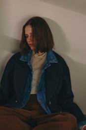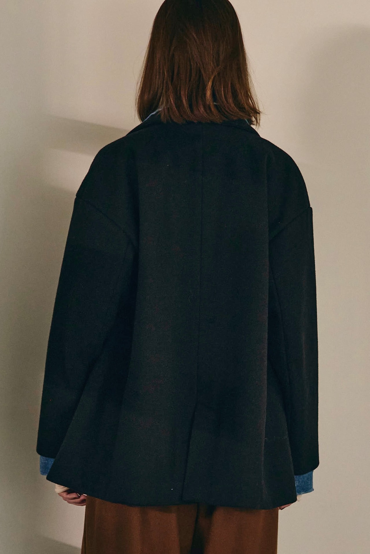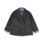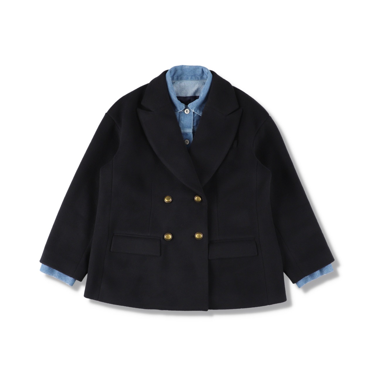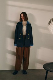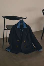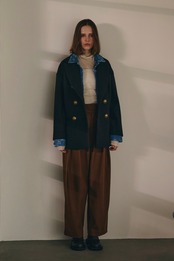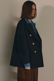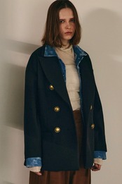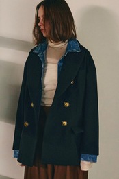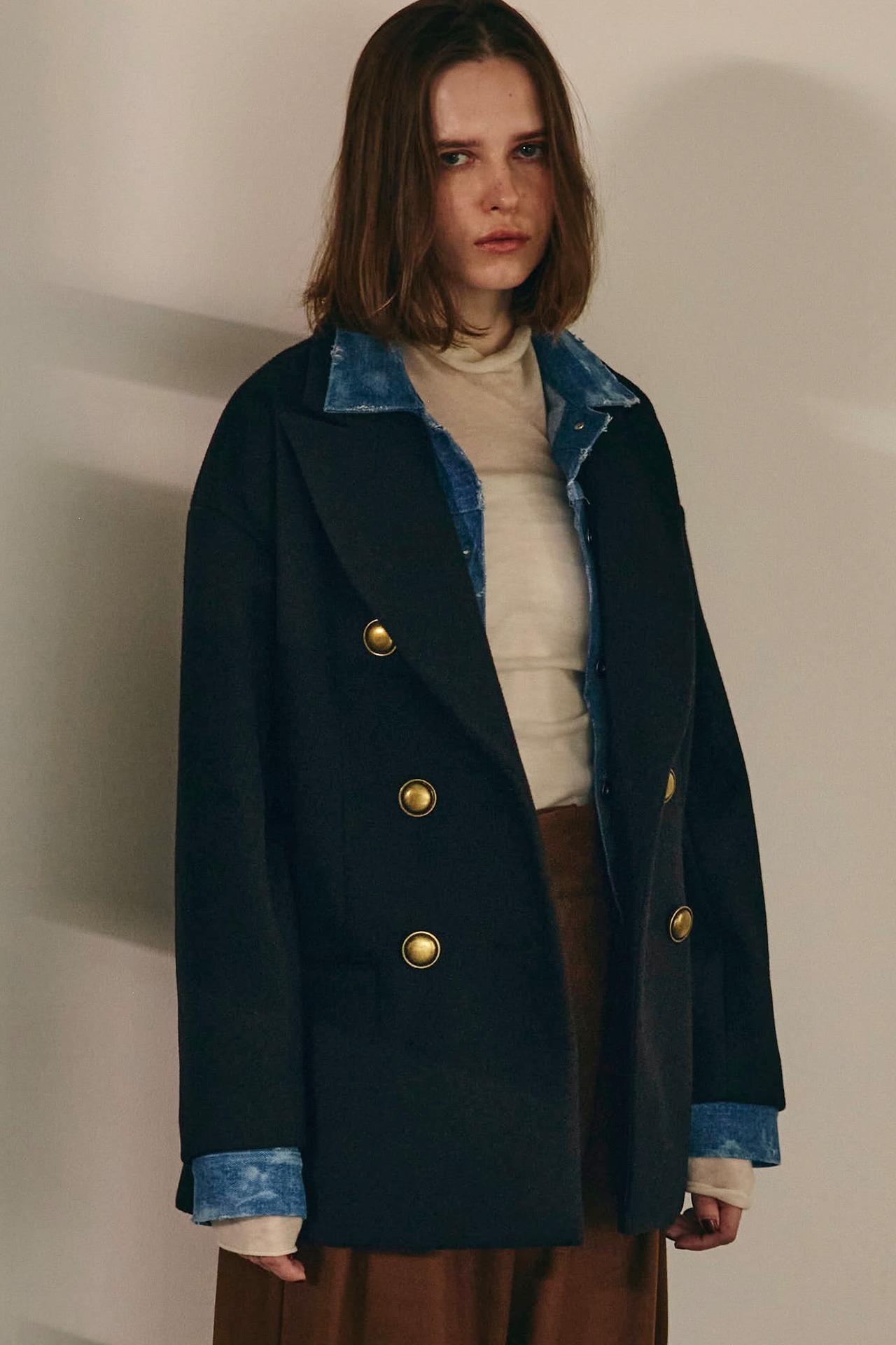 クラシックなピーコートに、デニムをのぞかせたようなレイヤードデザインを施した一着。