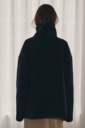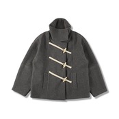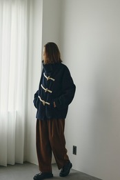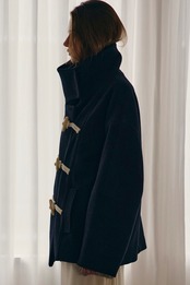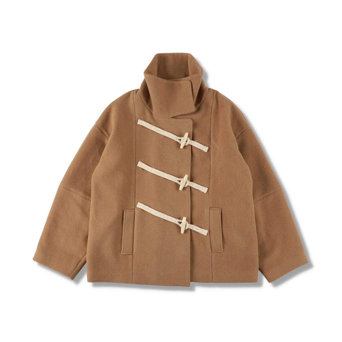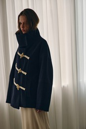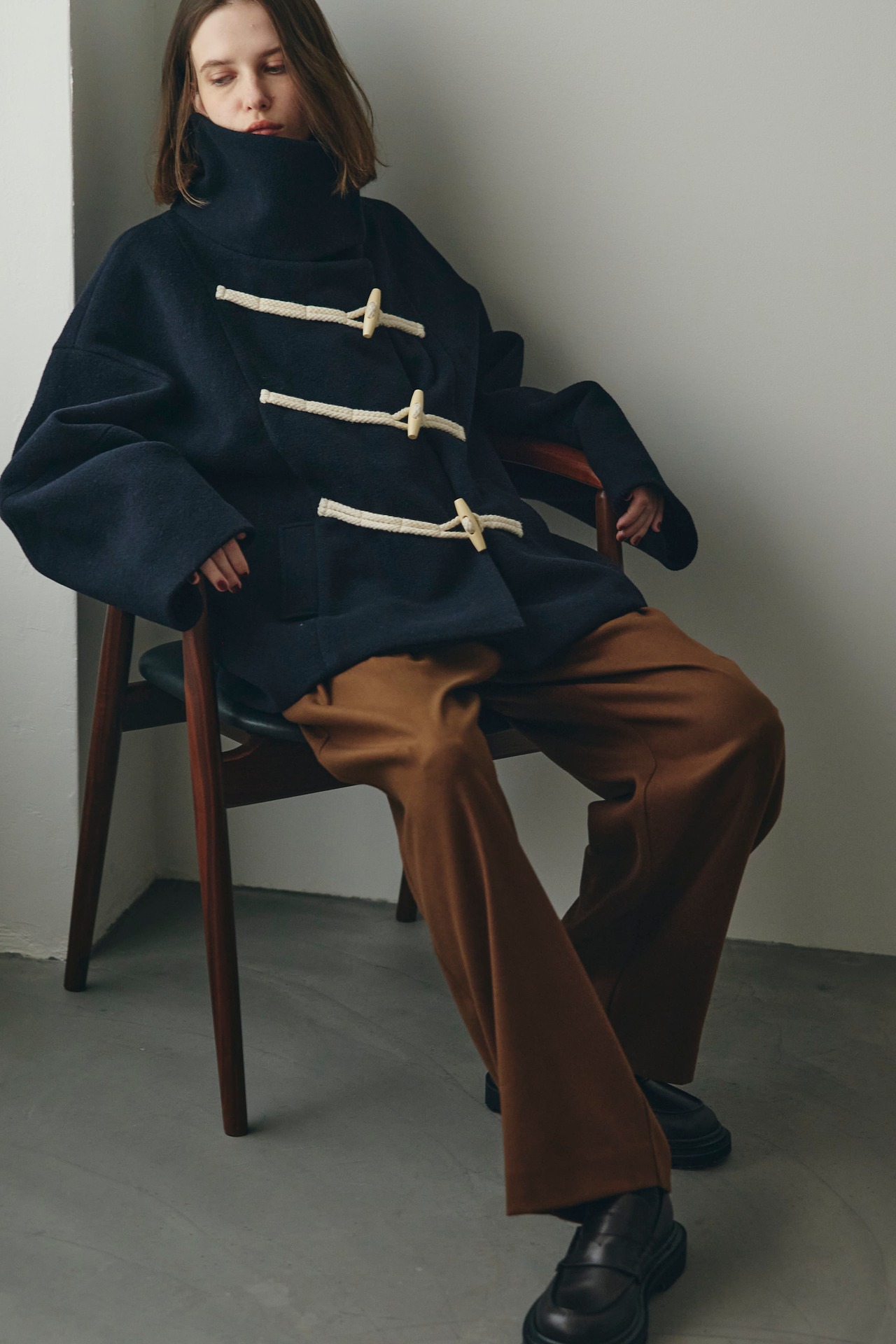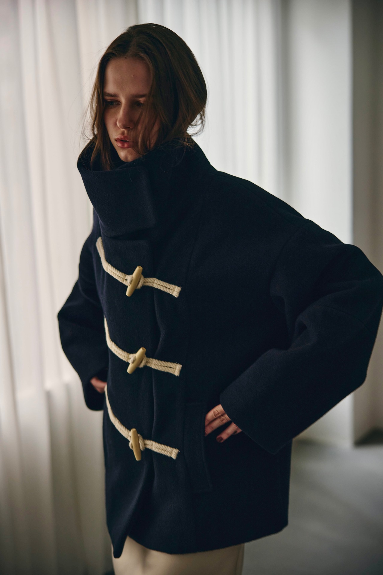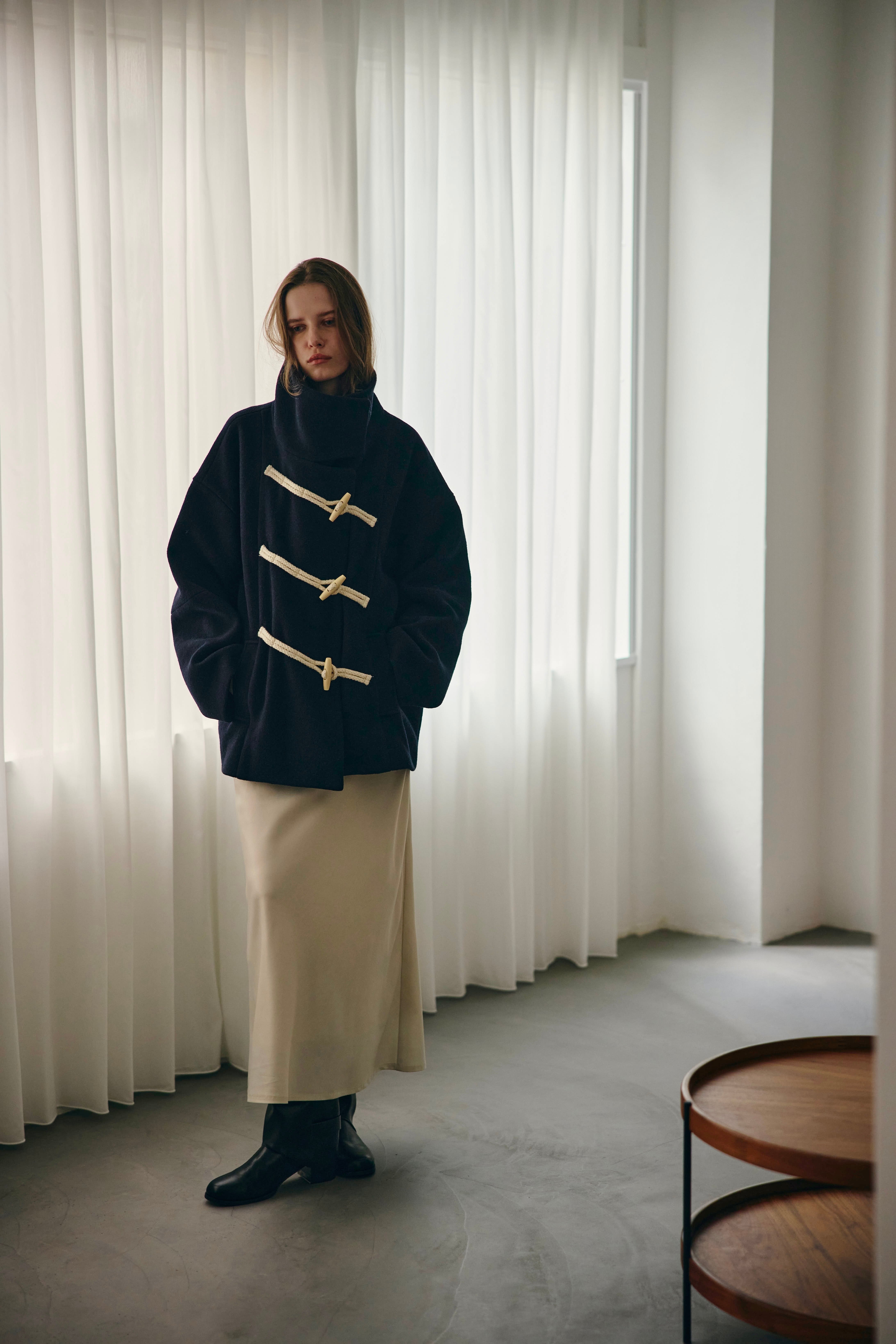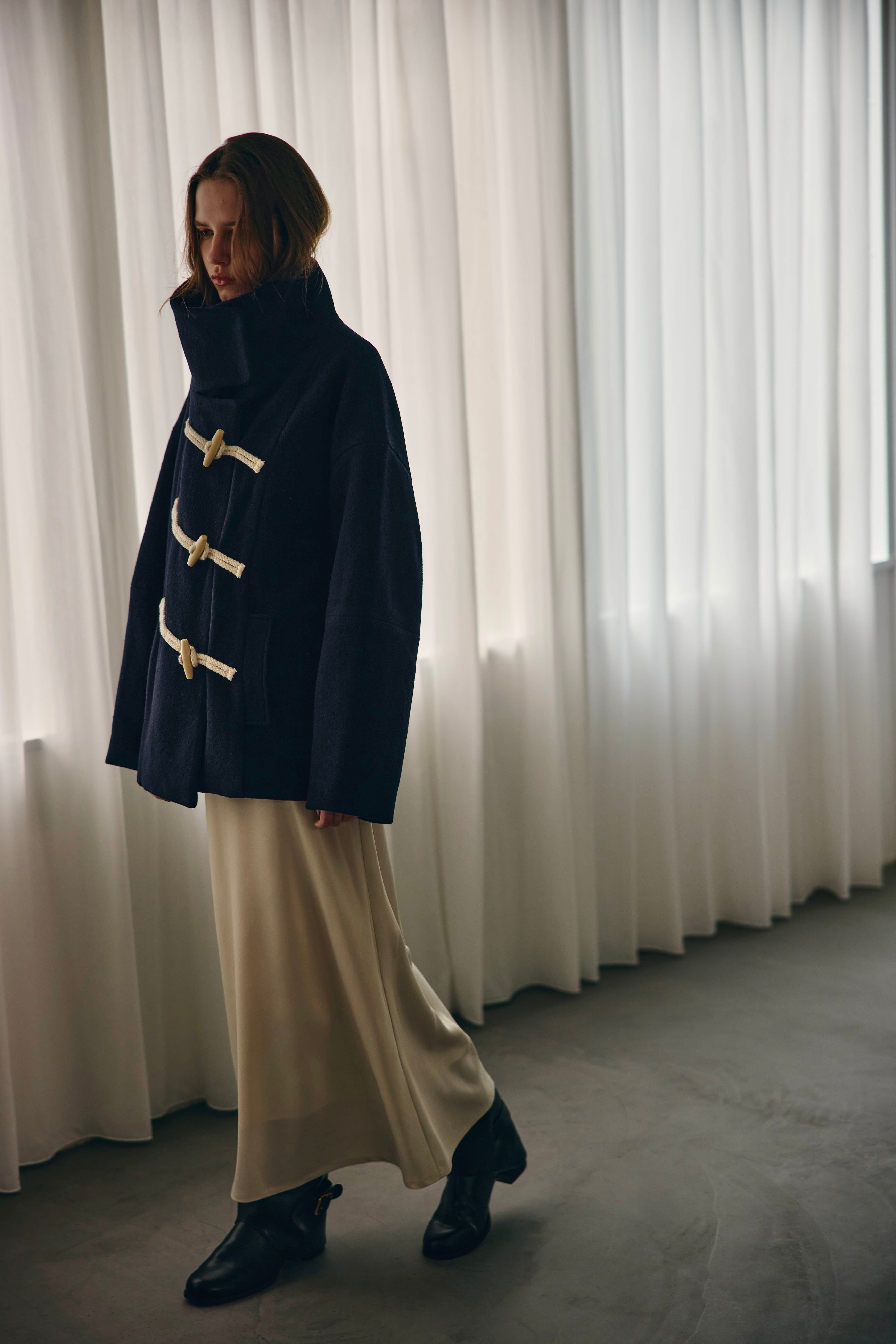 顔まわりをやさしく覆うハイネックデザインは、トグルの留め方で印象を変えられ、