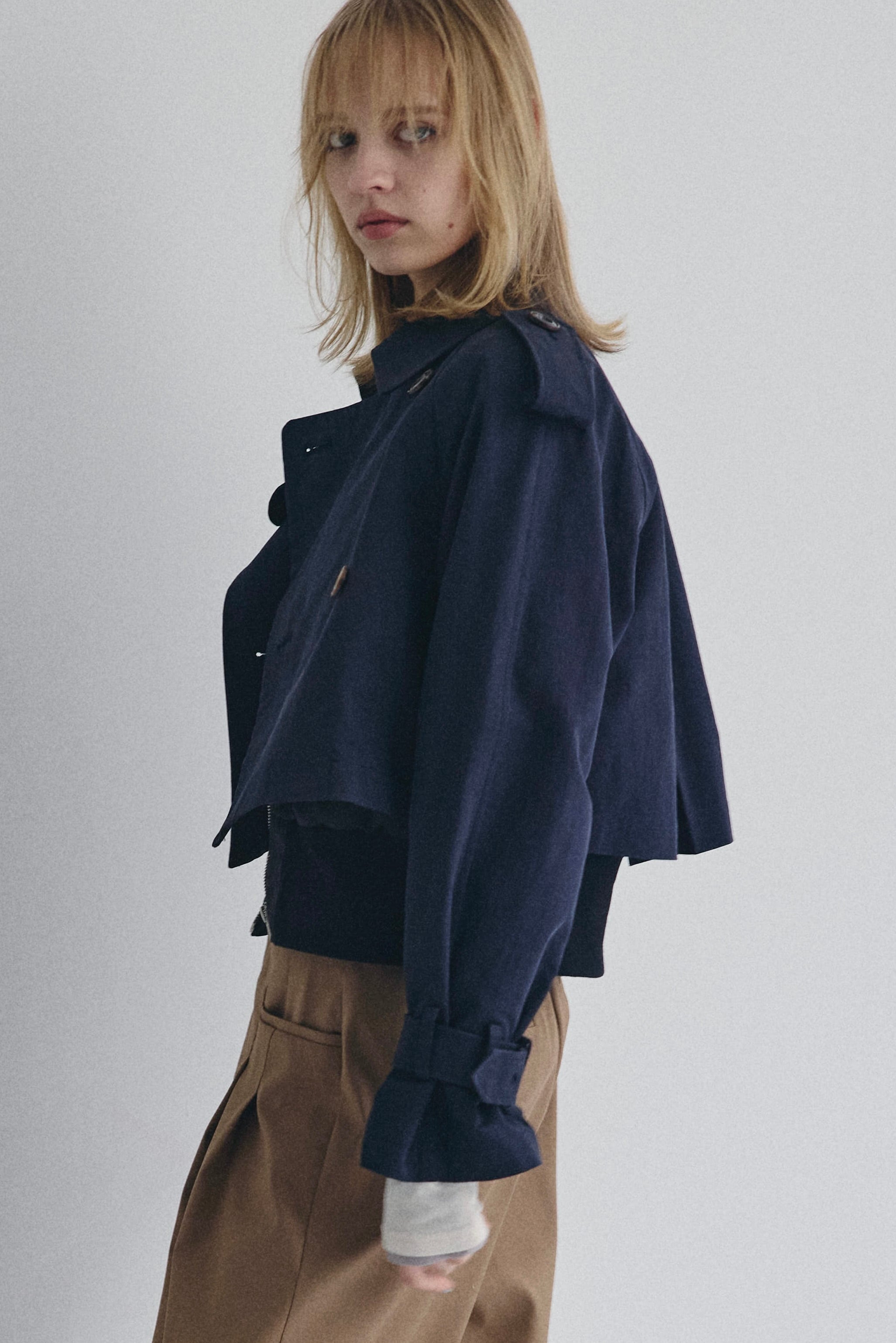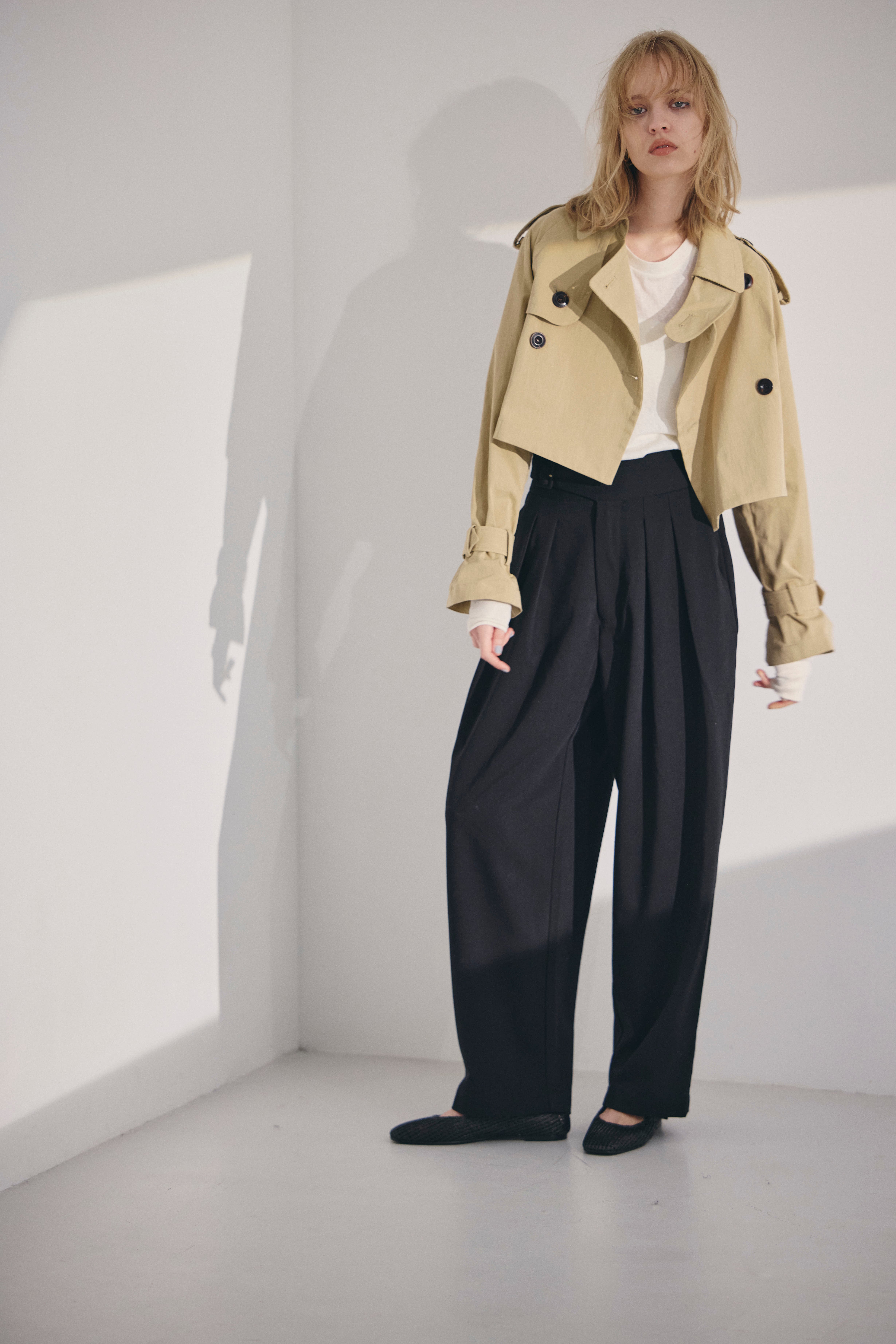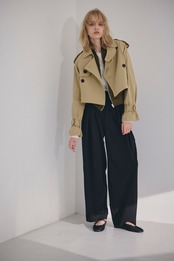 ショートトレンチはコンパクトな丈感でボトムとのバランスが取りやすく、ワイドパンツやロングスカートとも好相性。