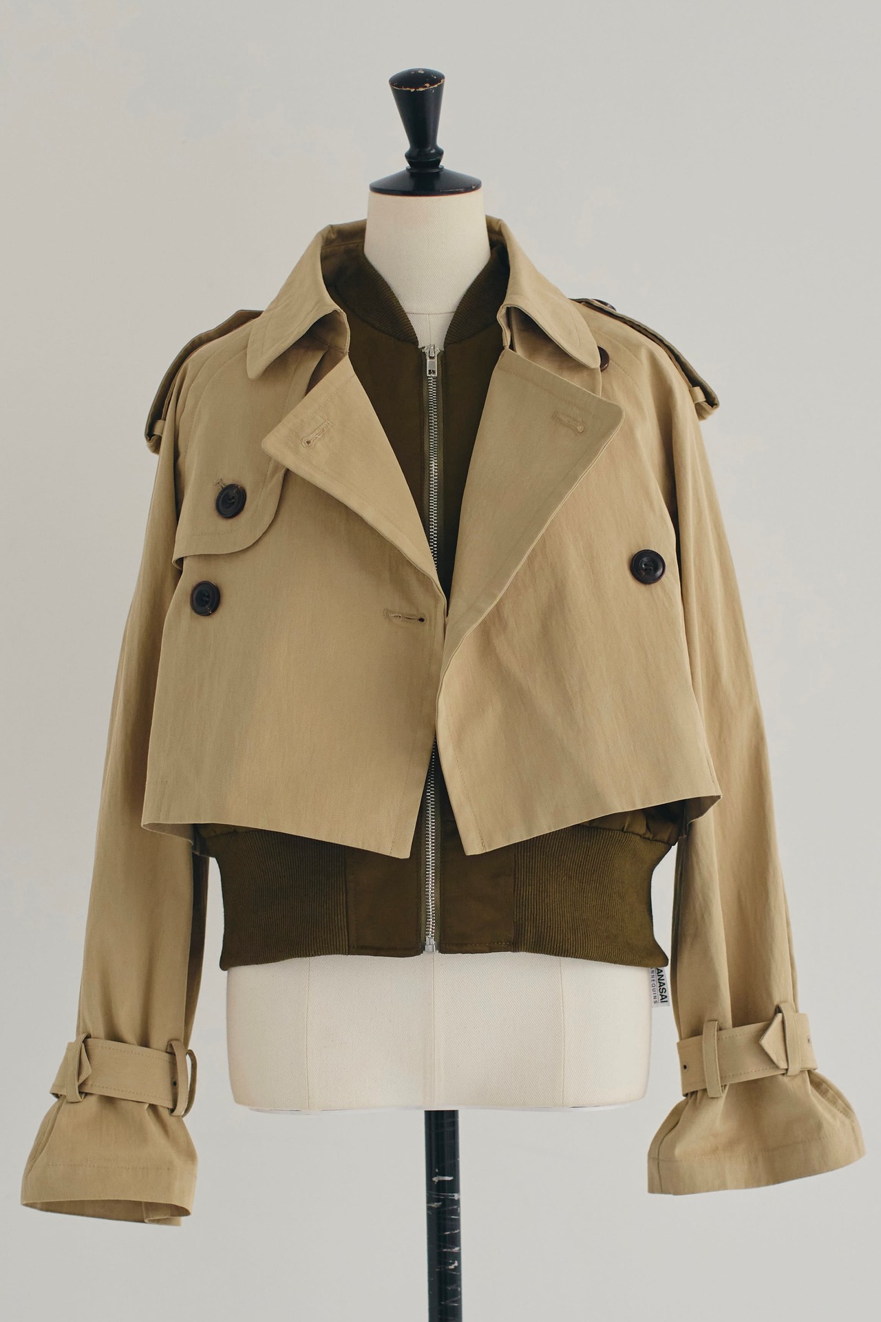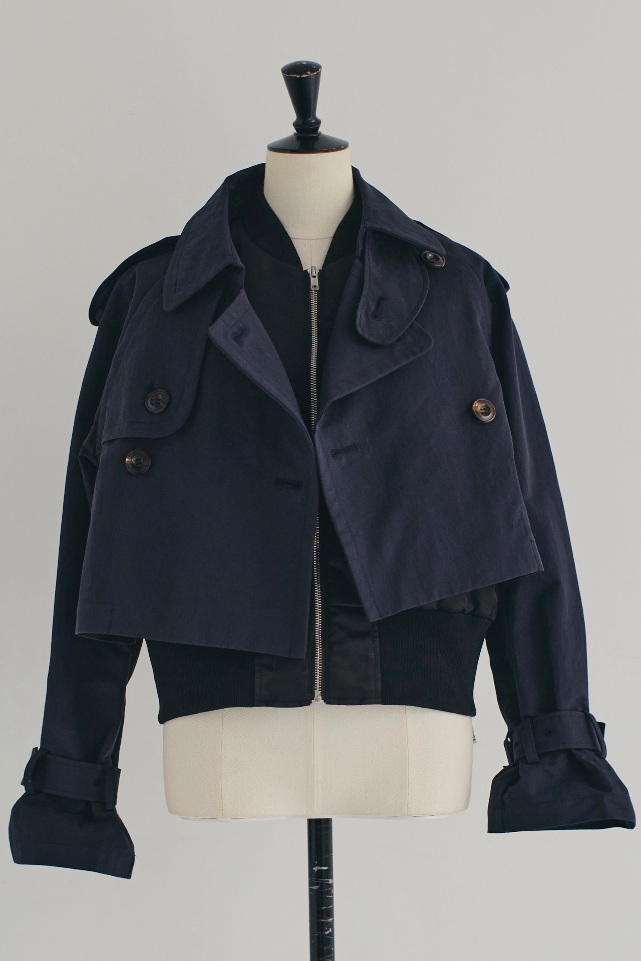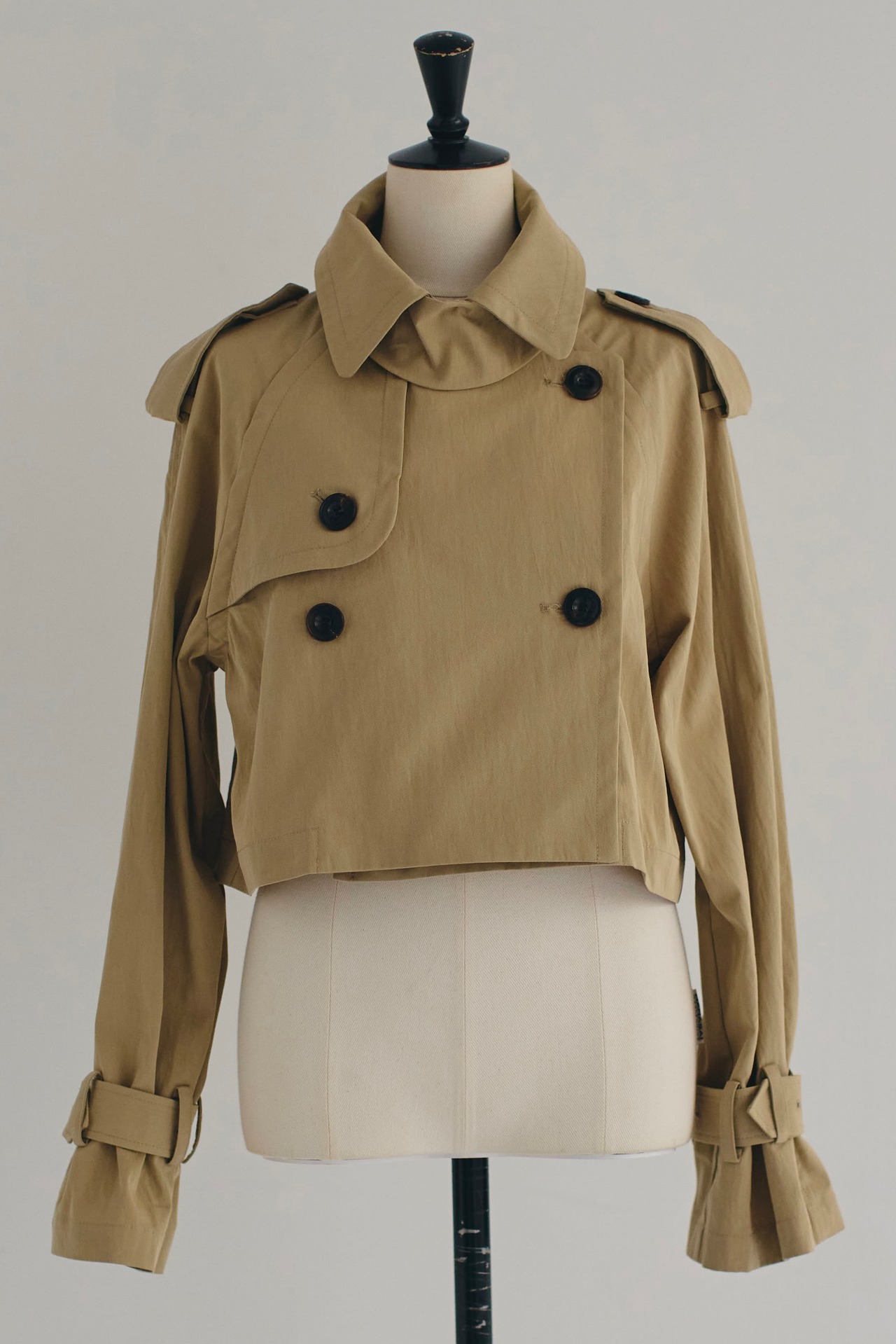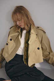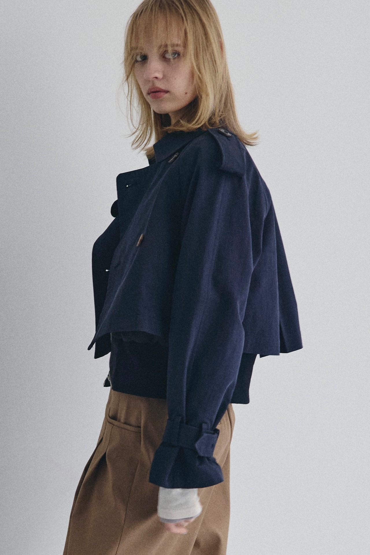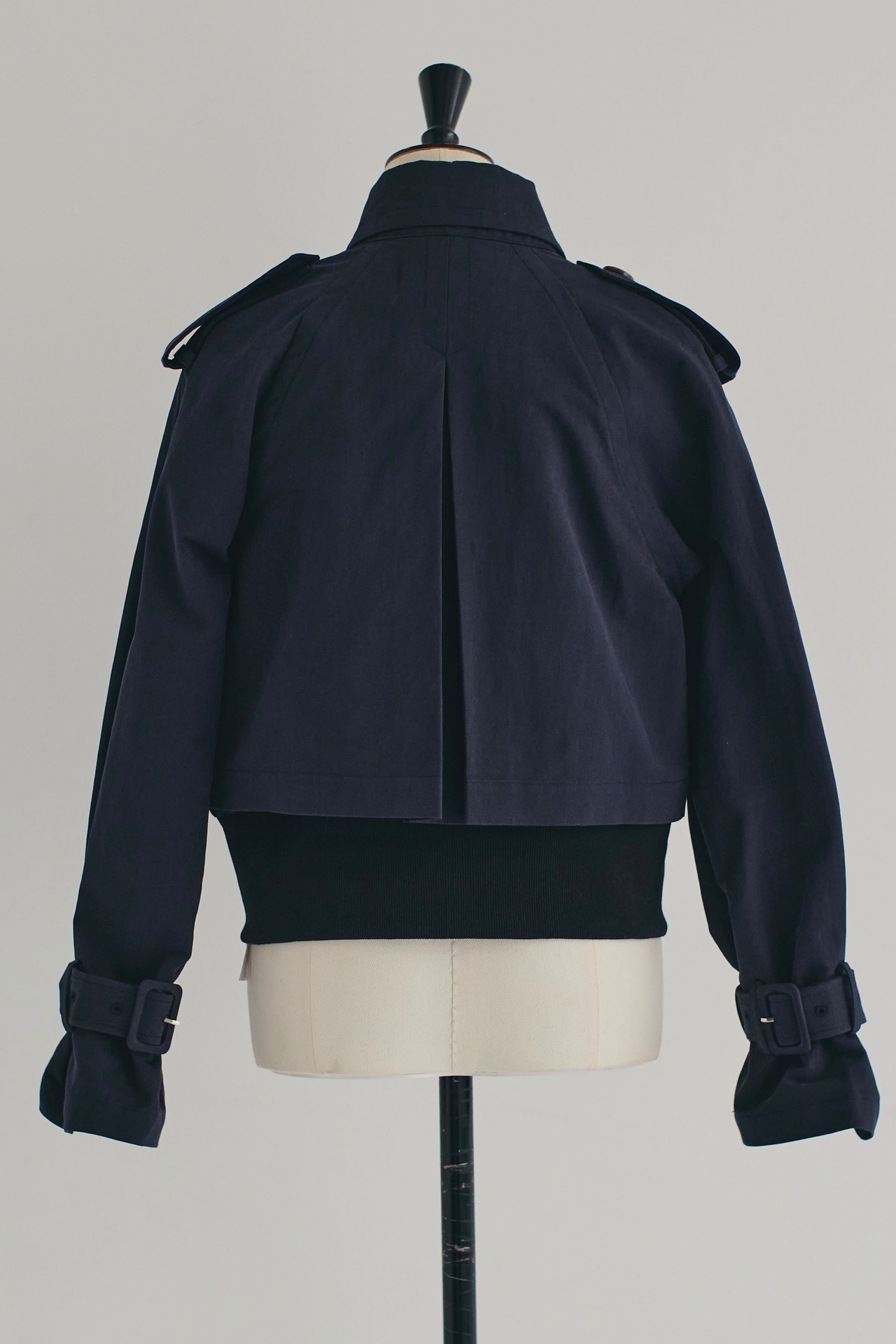 ショート丈のトレンチコートに、ナイロン素材のジレがセットになったアウターシリーズ。