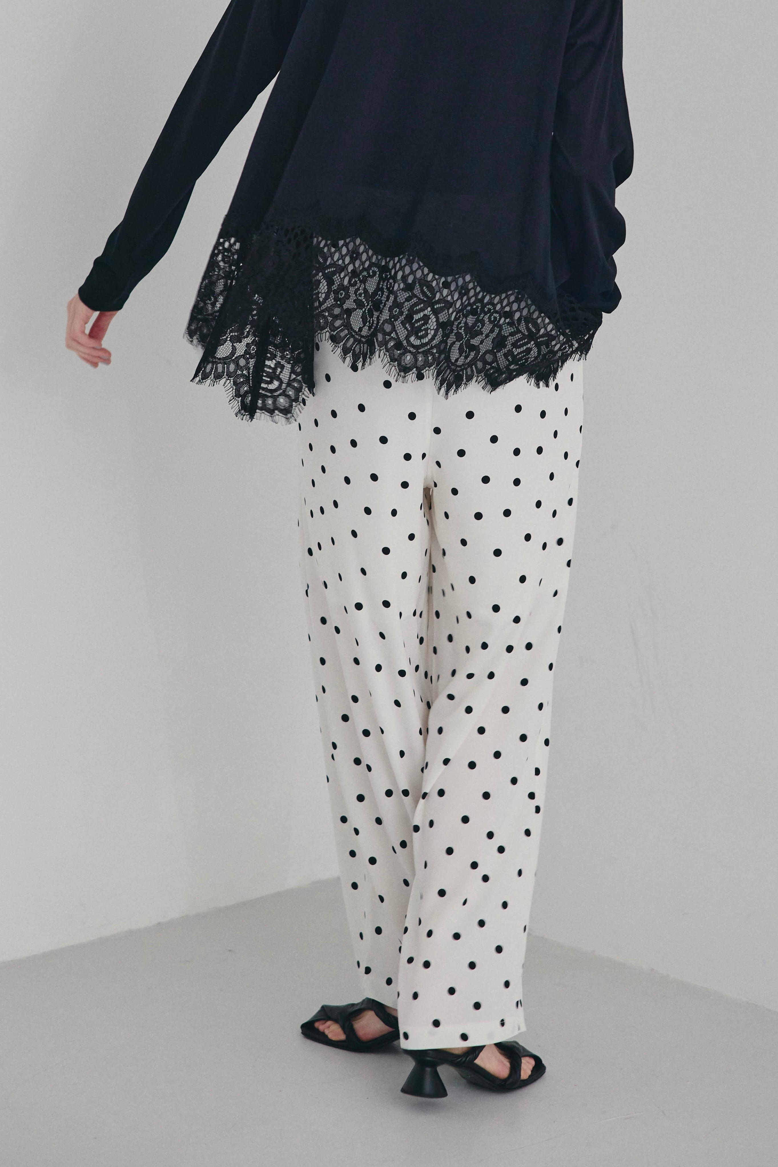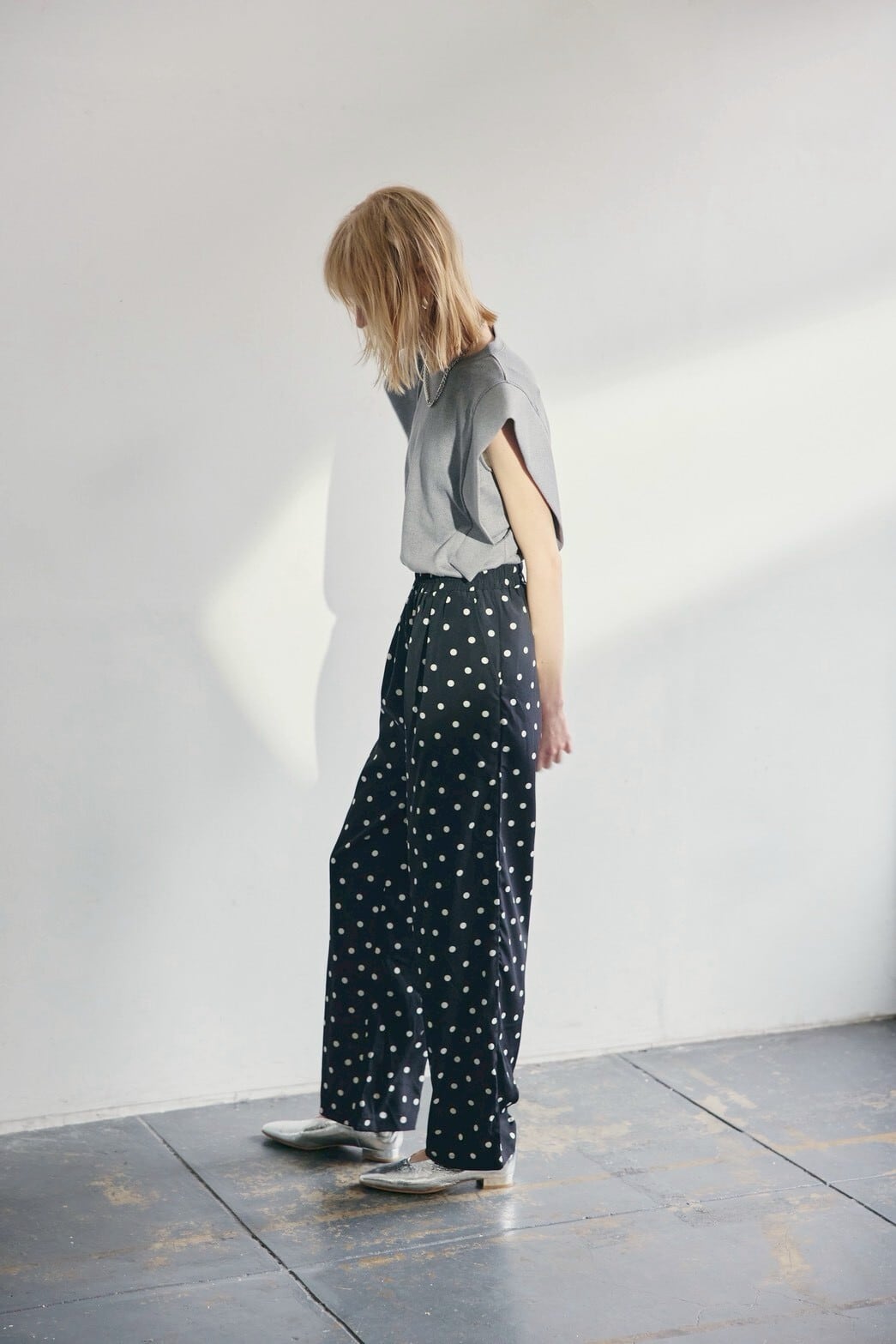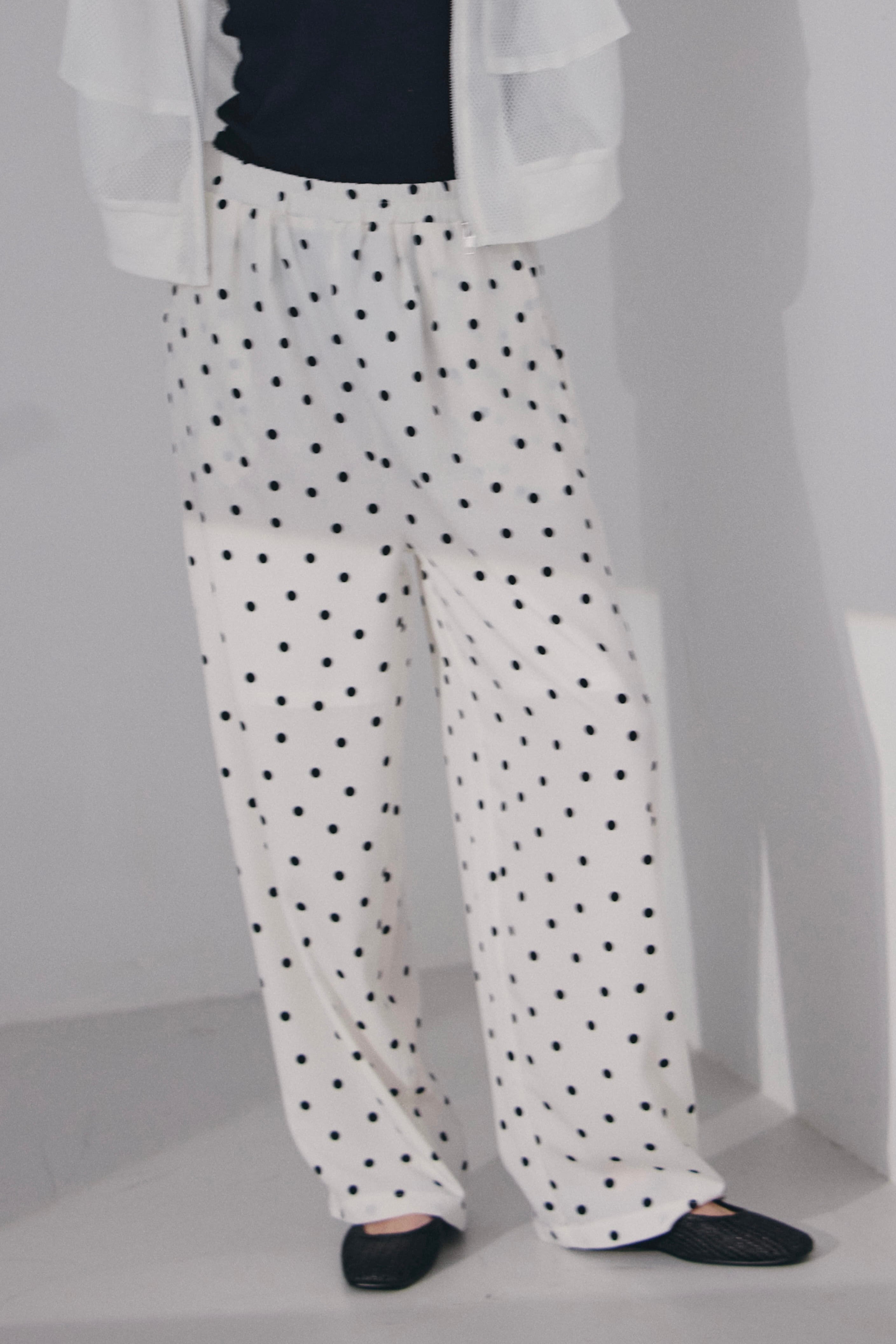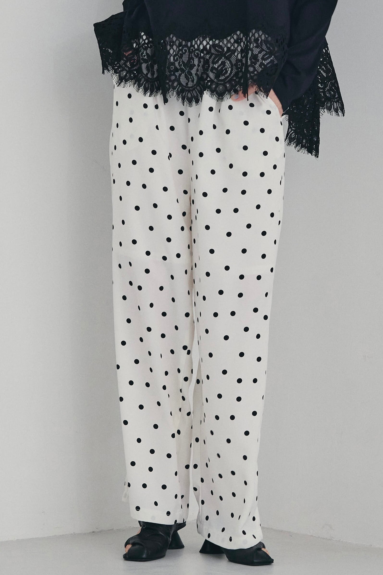 落ち着いた表情の抜染ドットを使用した、イージーパンツ。