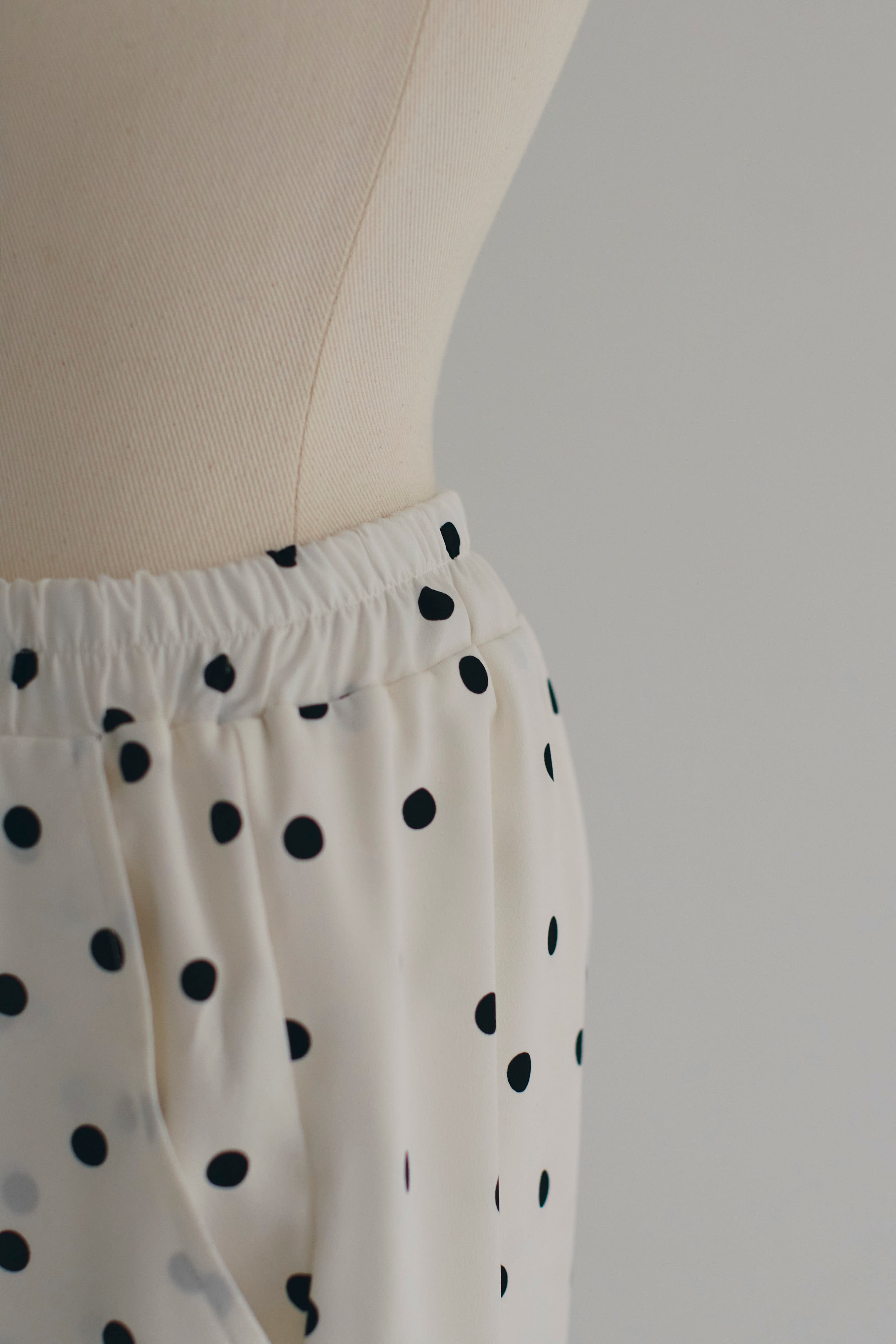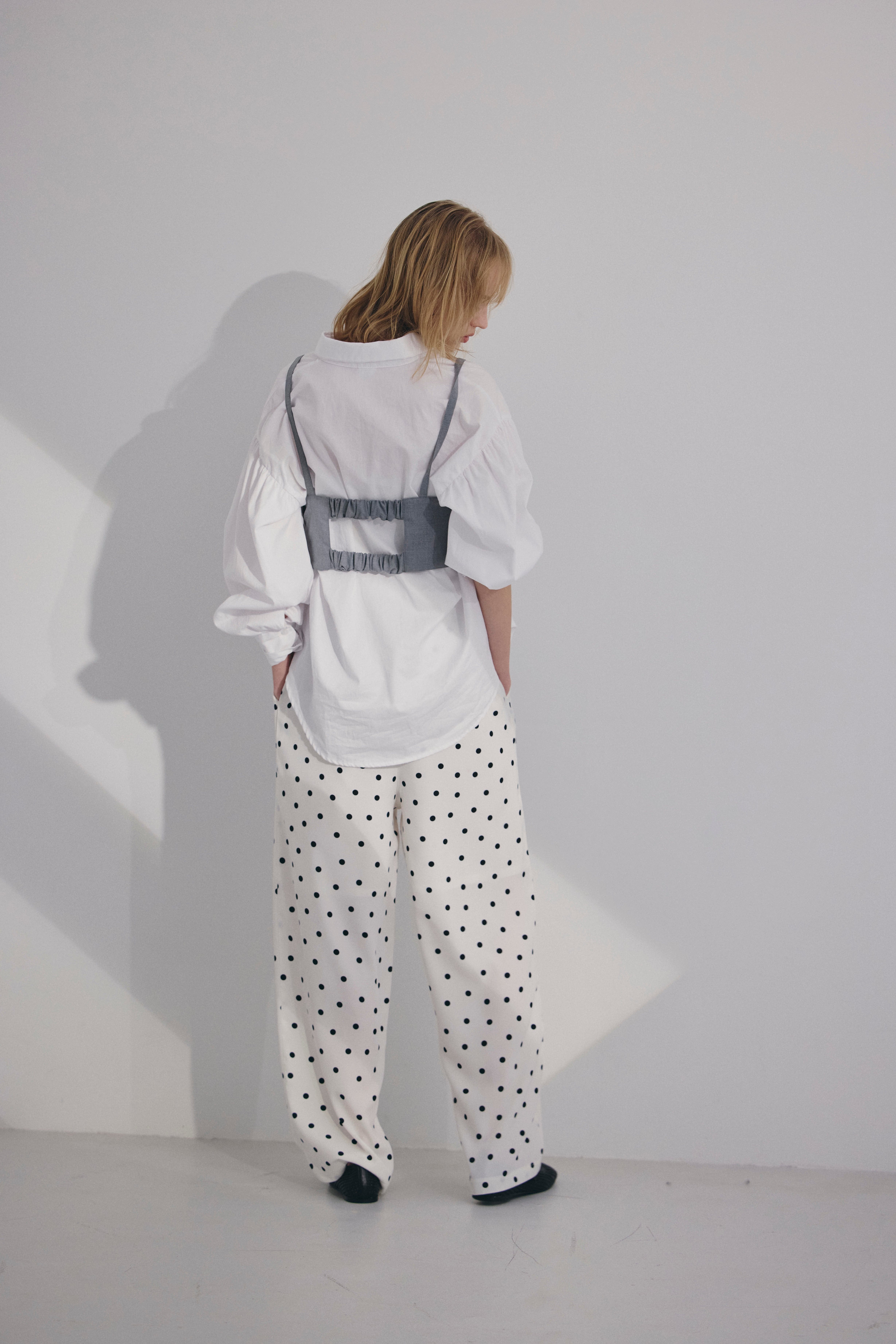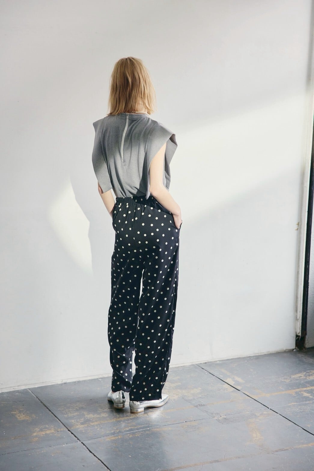 落ち着いた表情の抜染ドットを使用した、イージーパンツ。