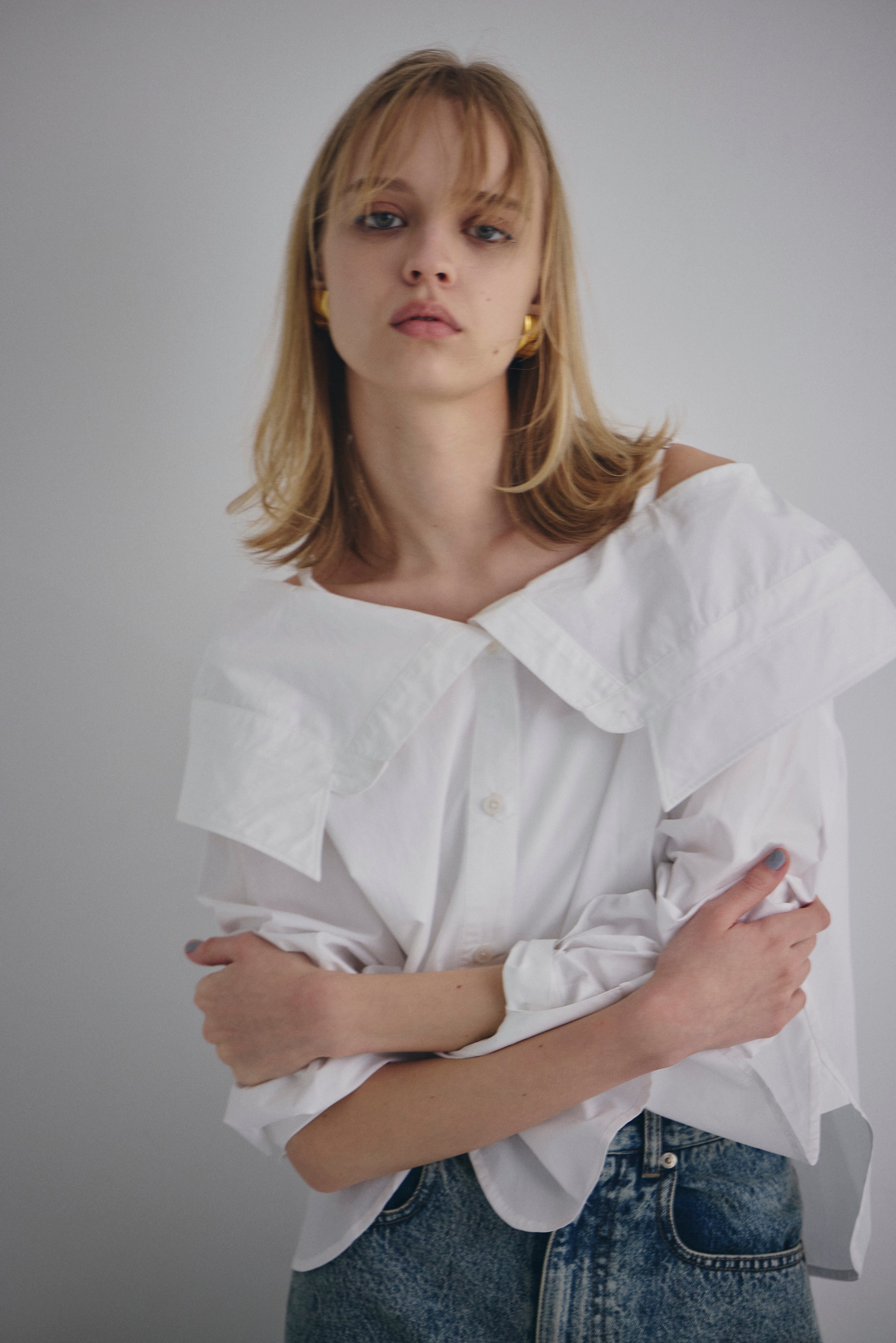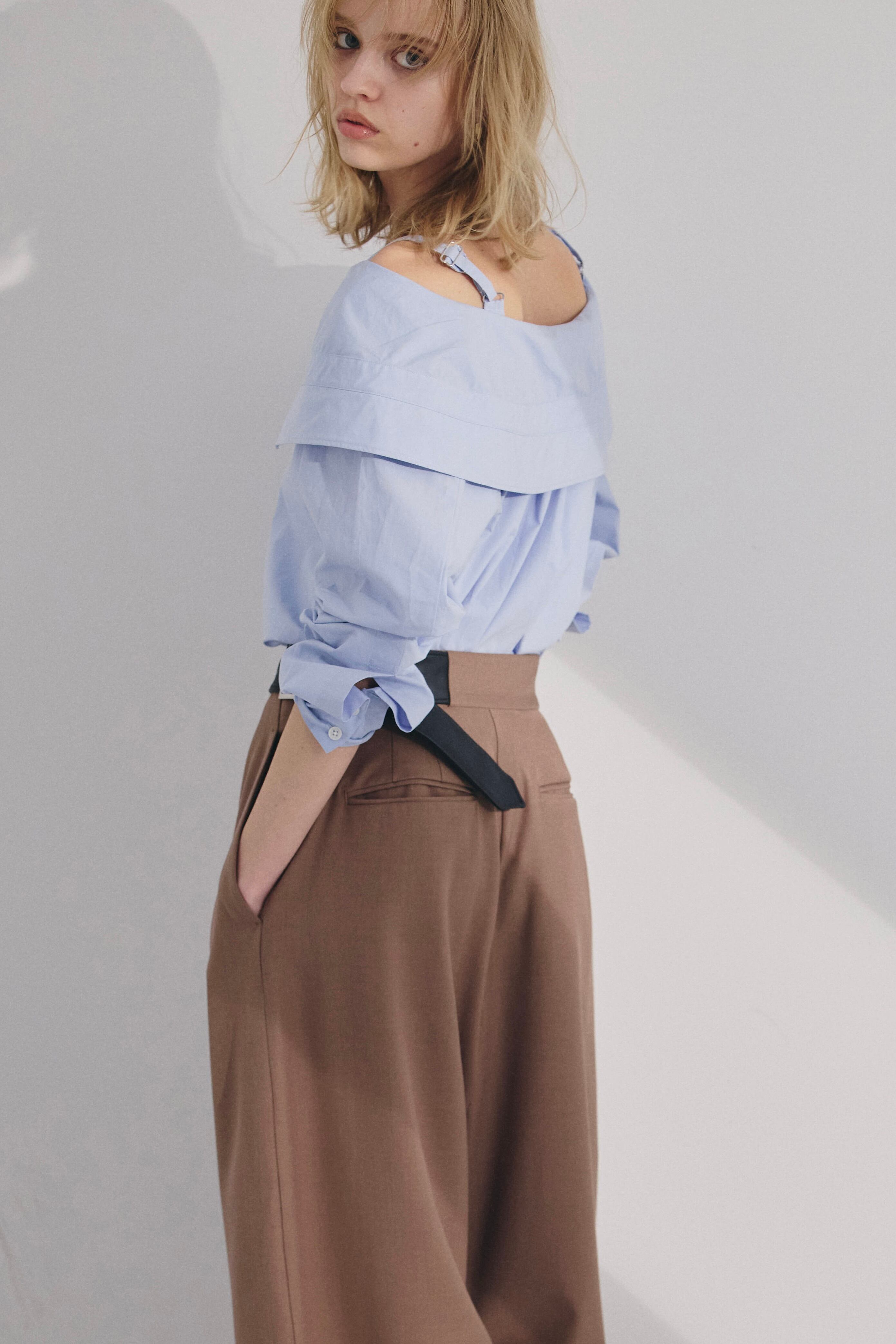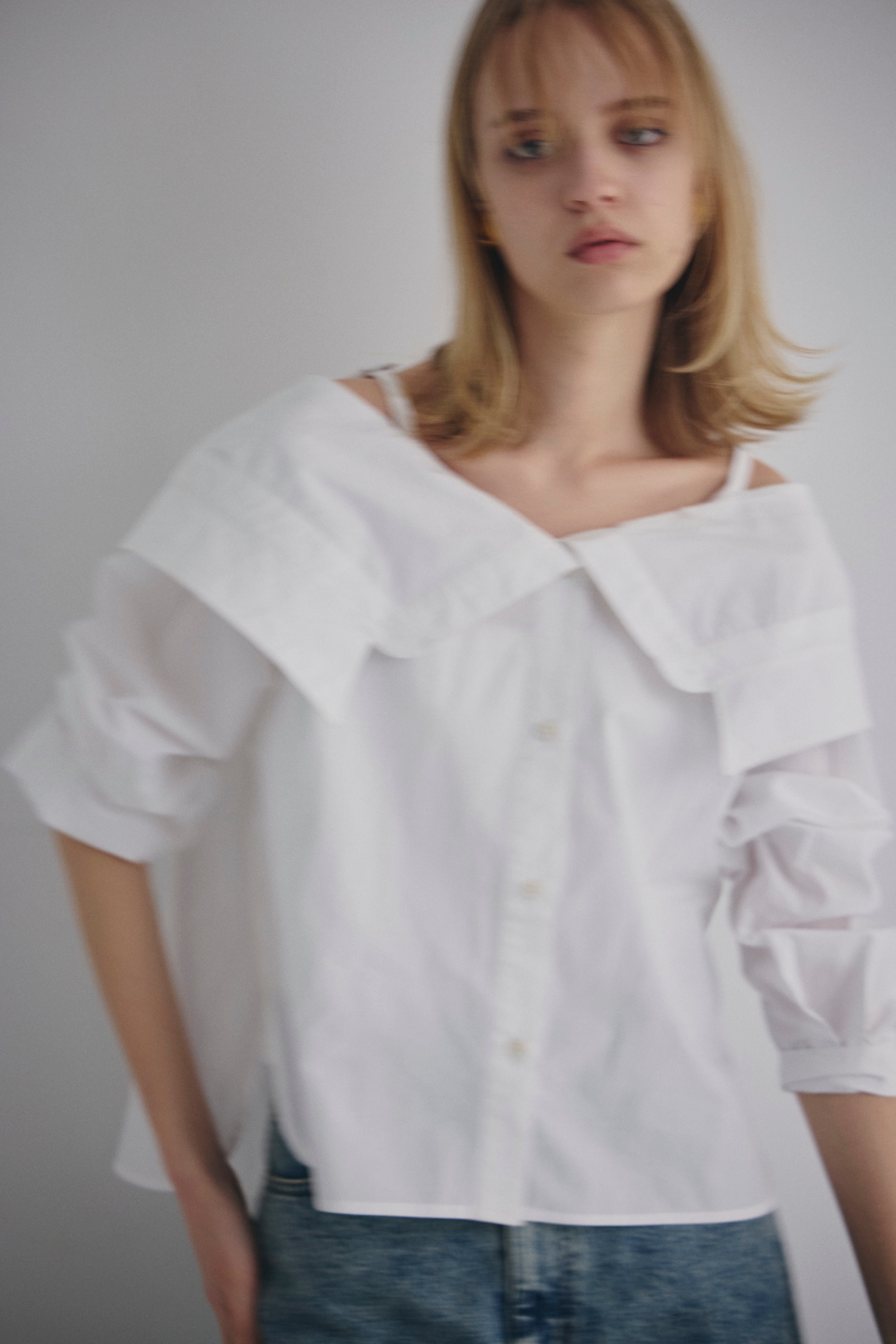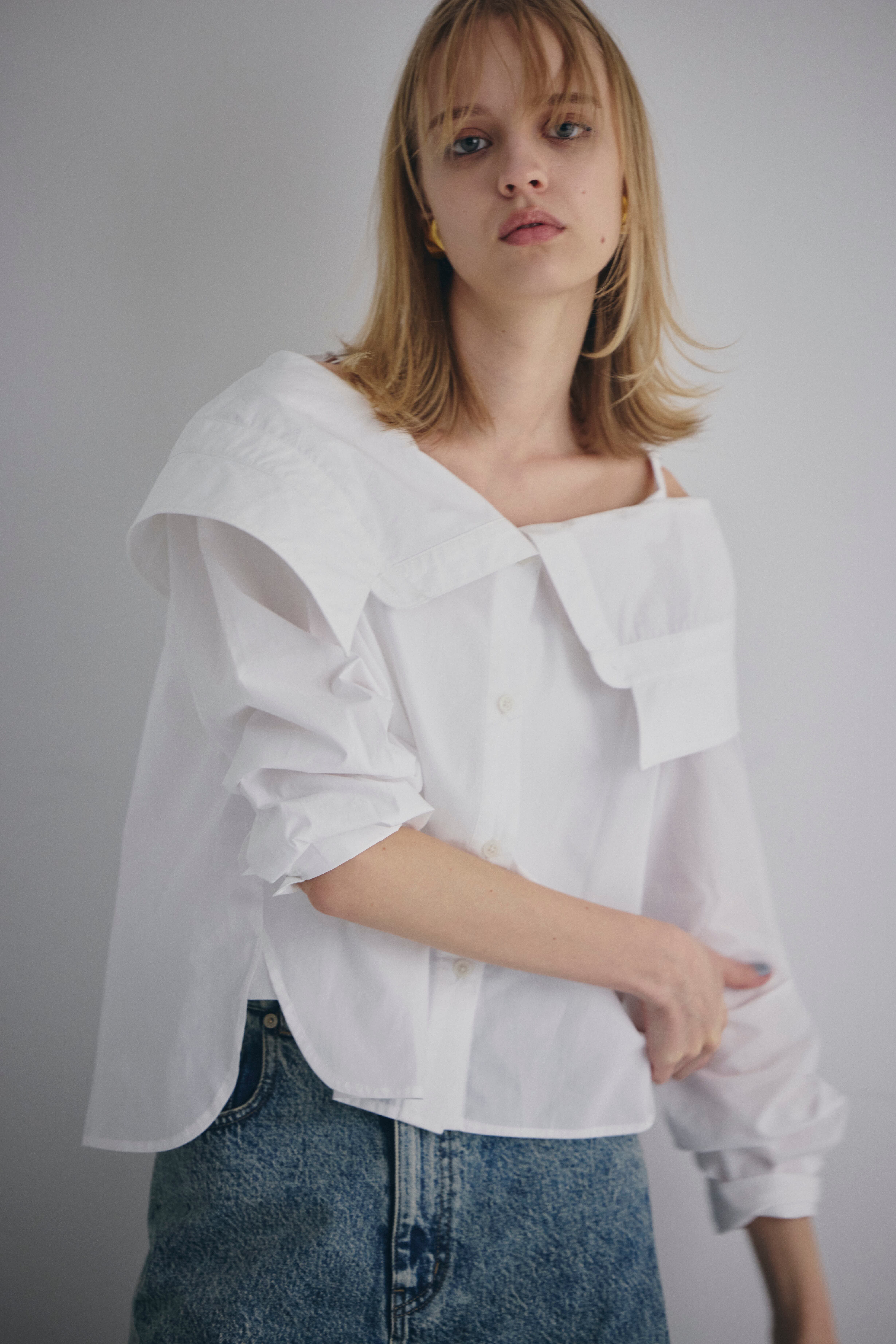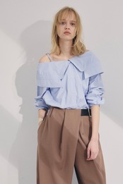 オフショルダーで着られる、抜け感のあるデザインシャツ。