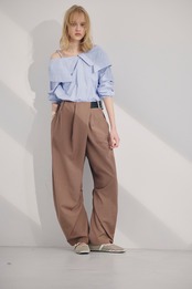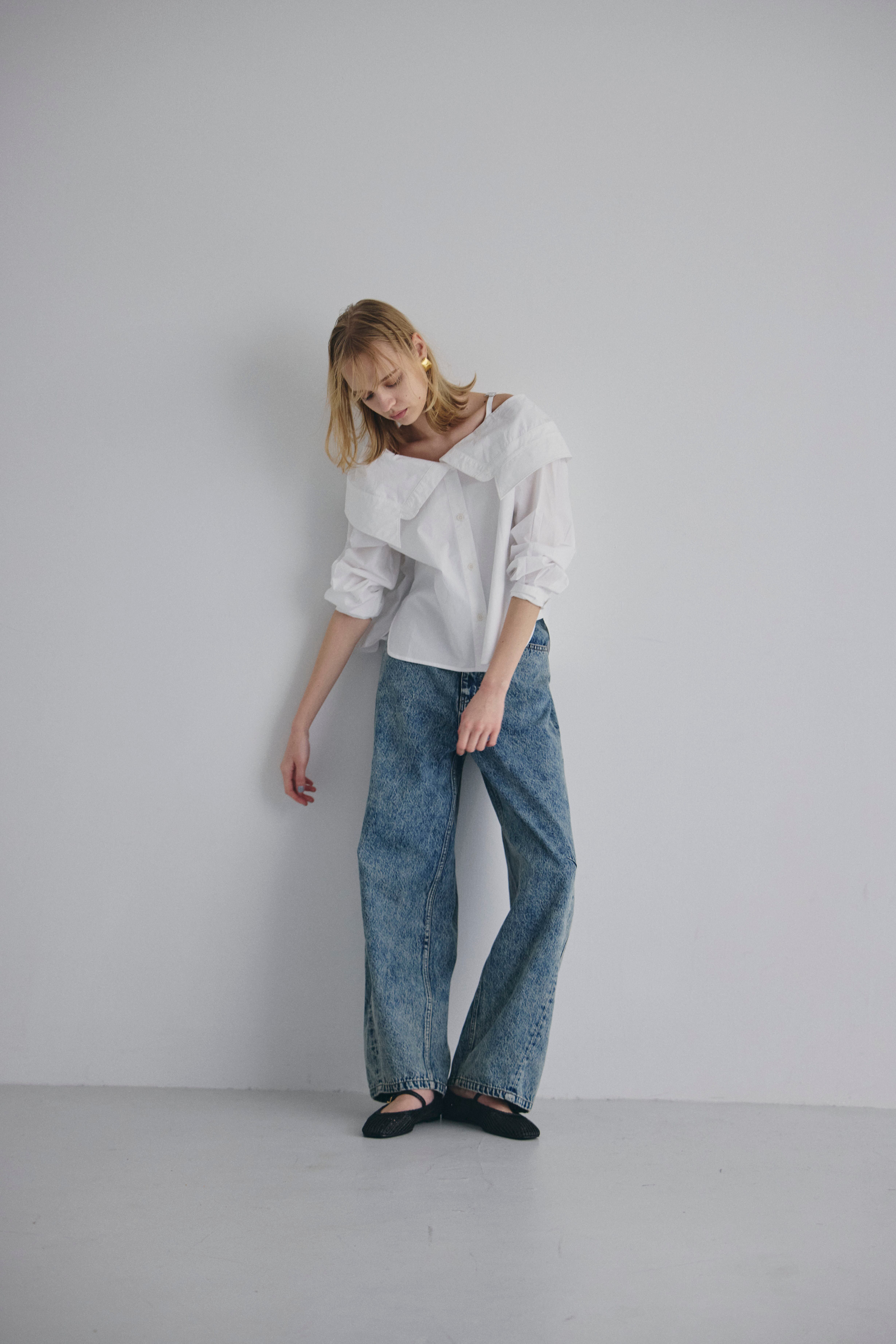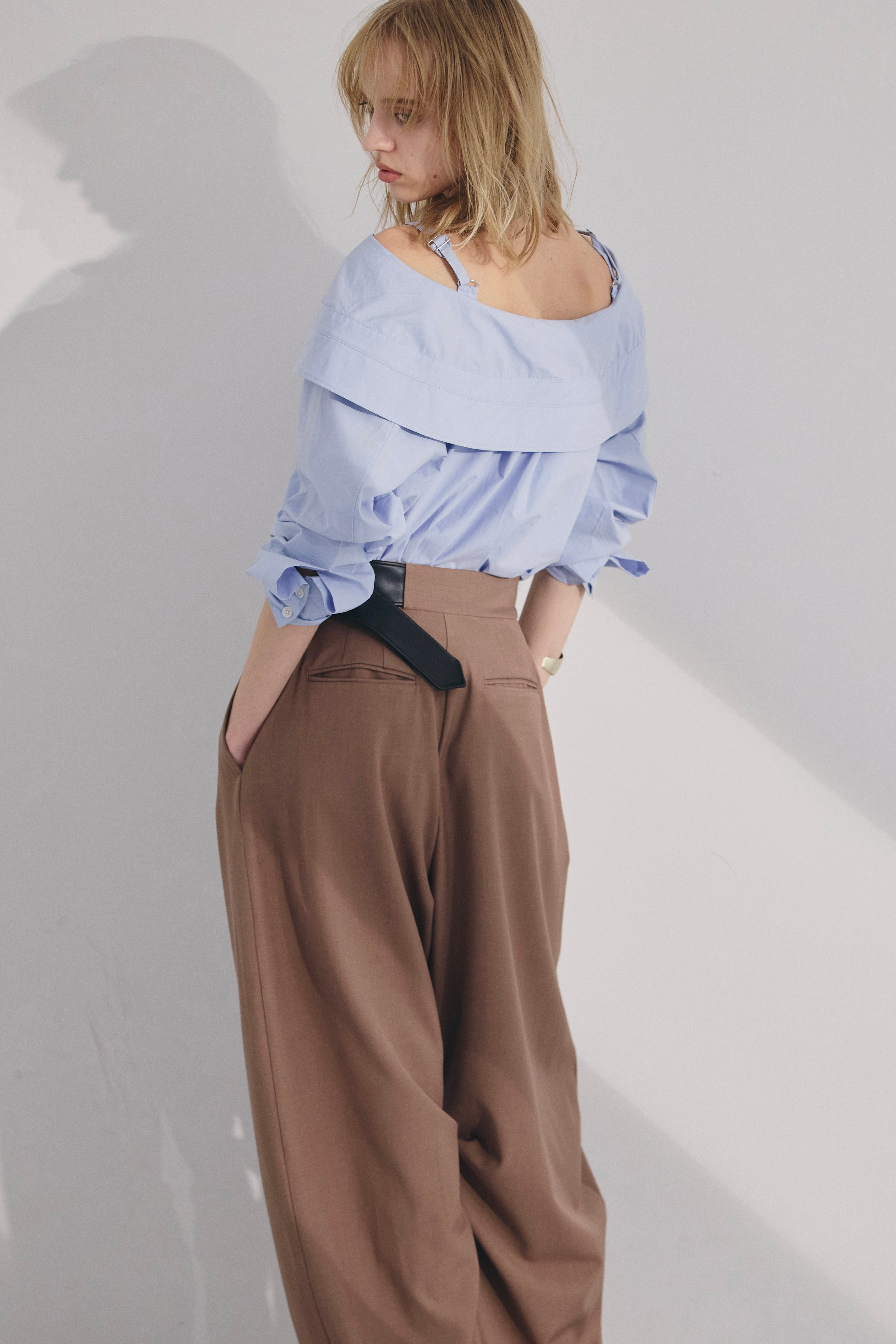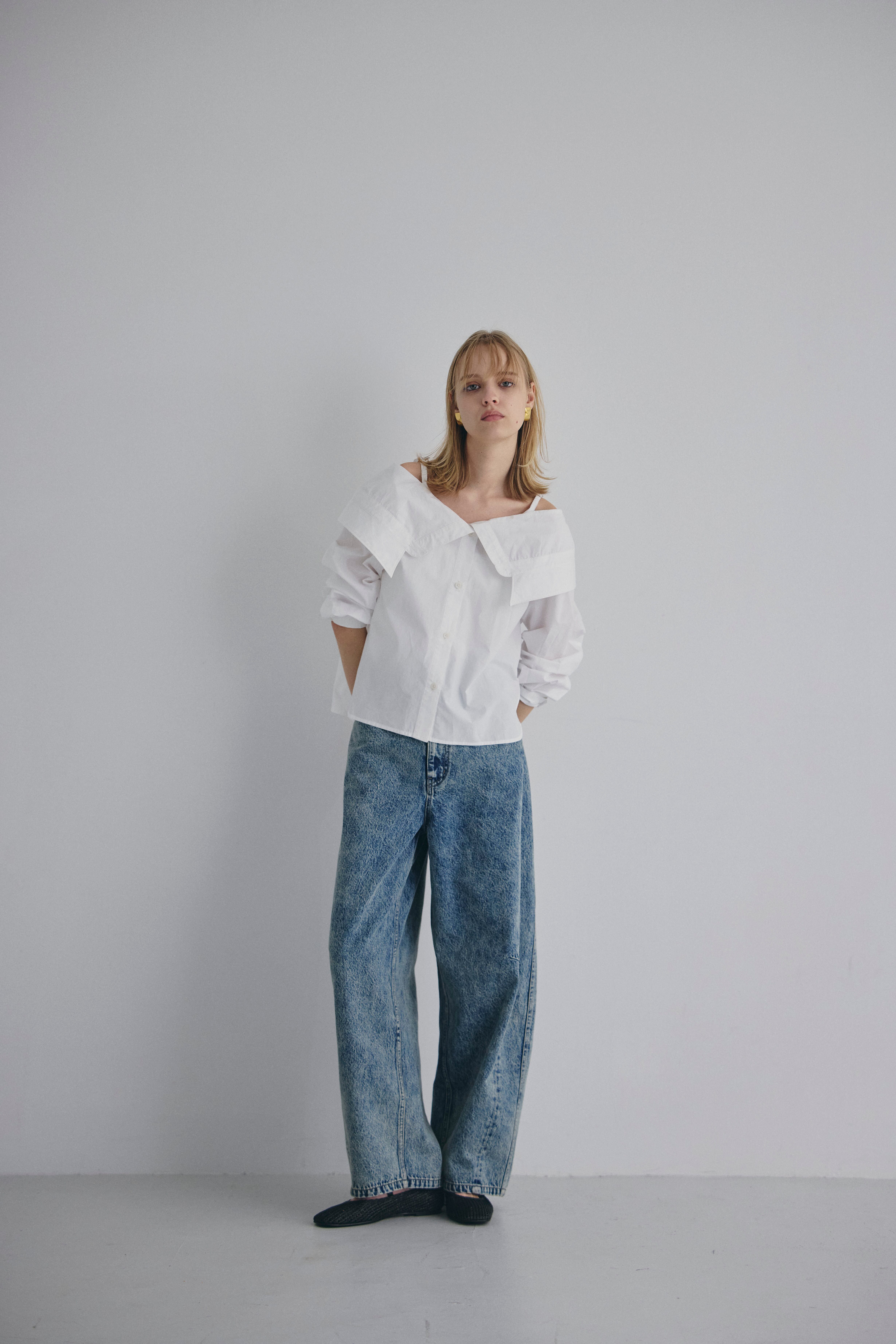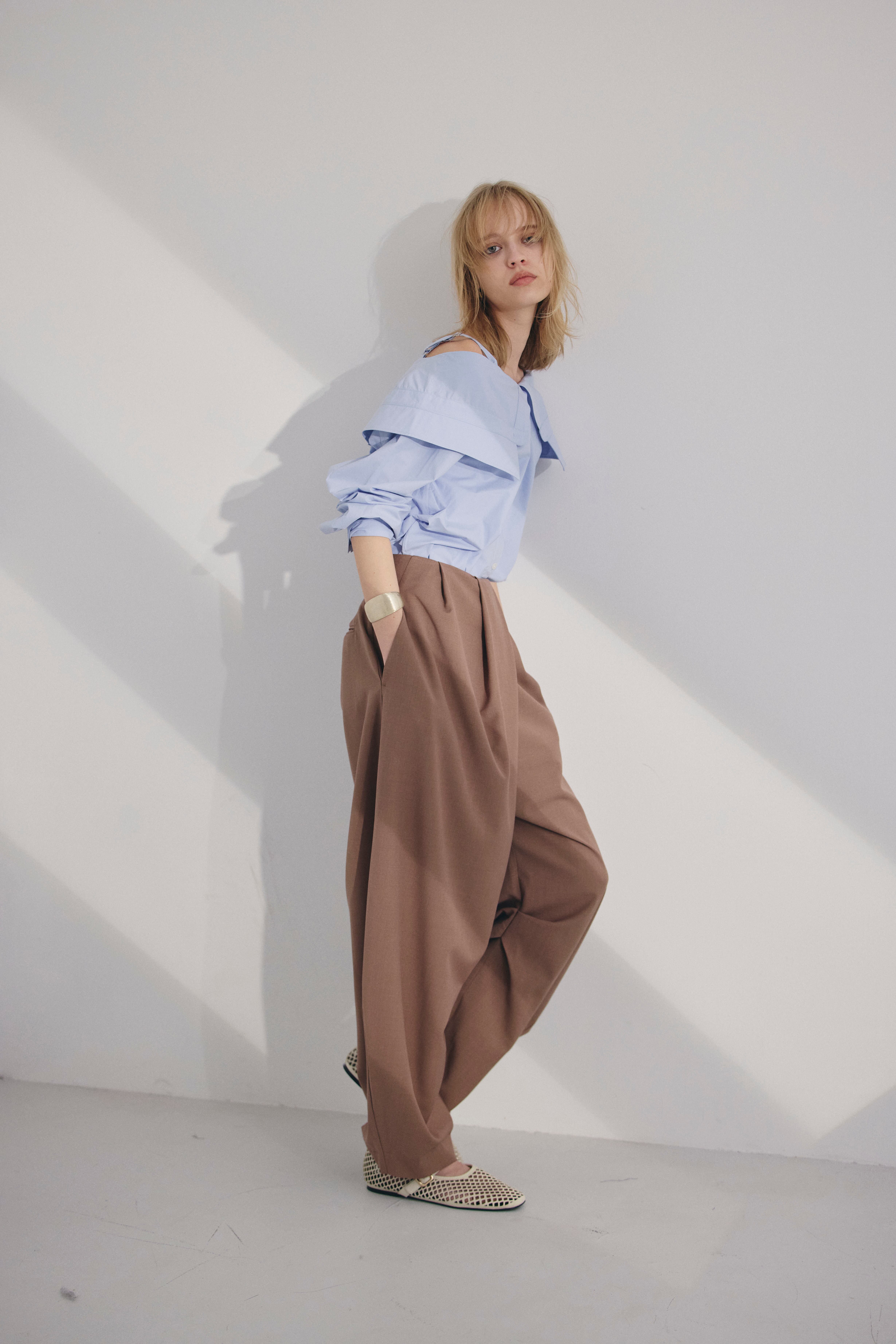 オフショルダーで着られる、抜け感のあるデザインシャツ。