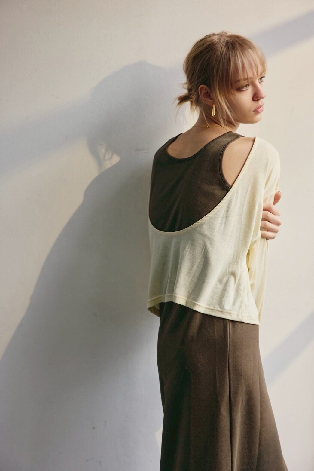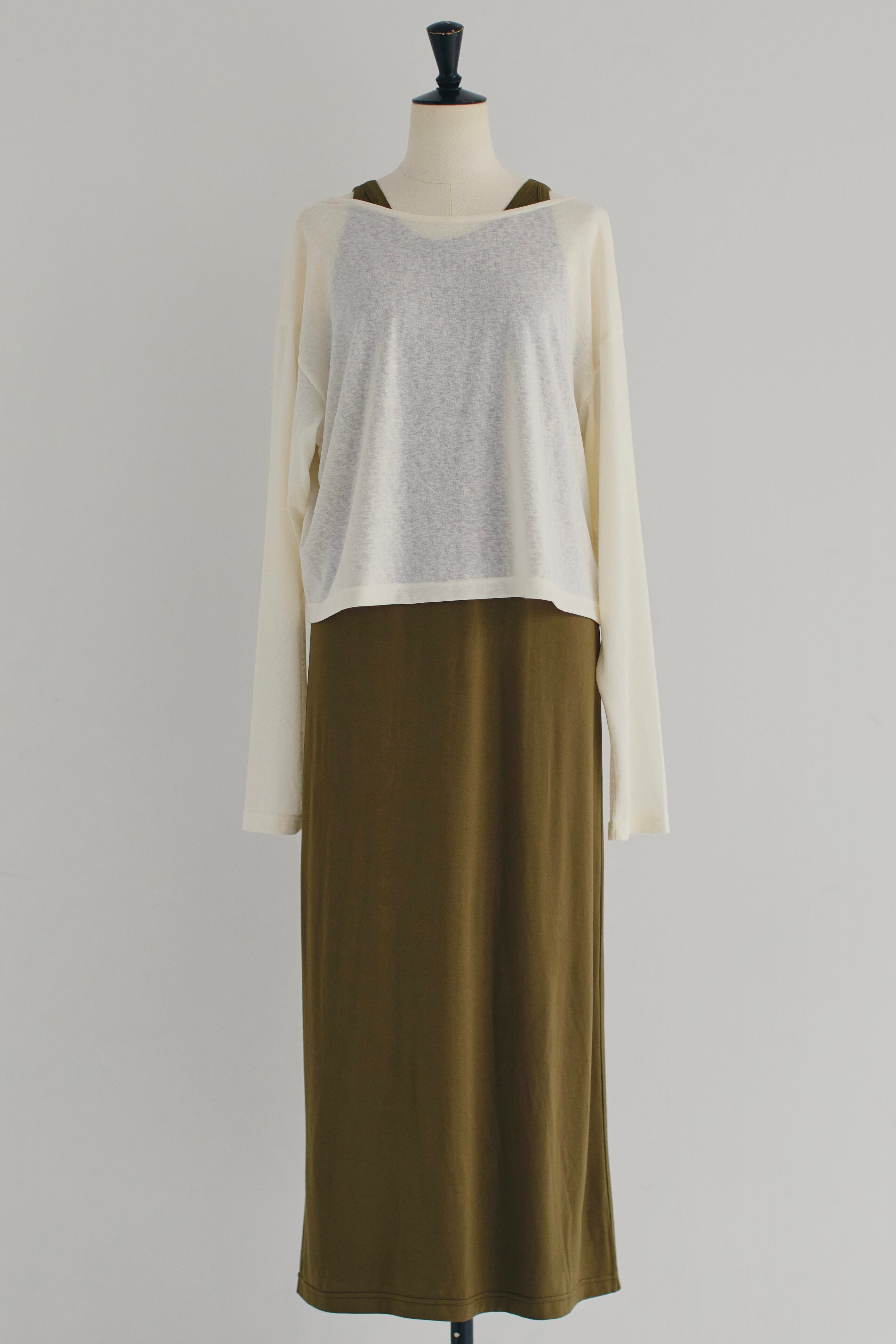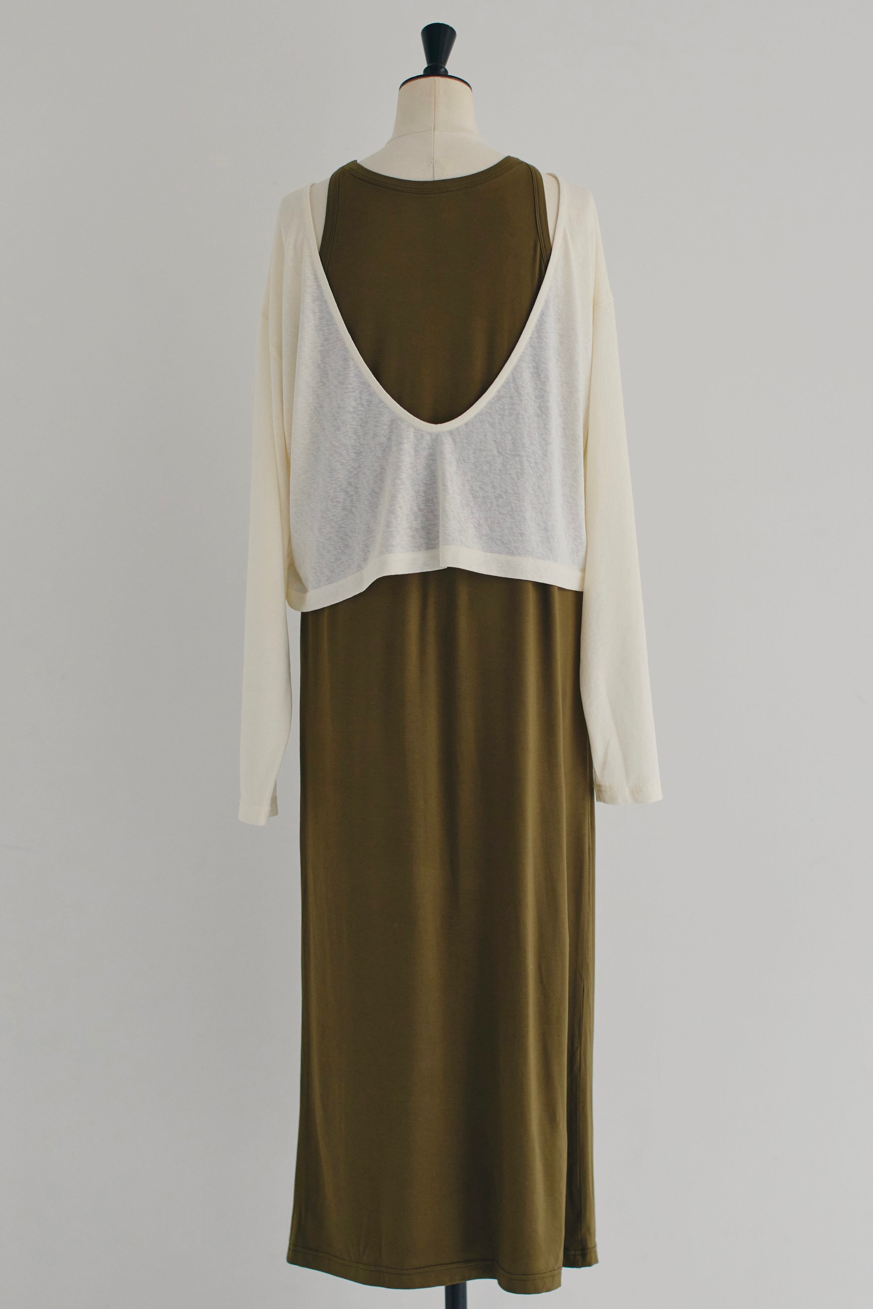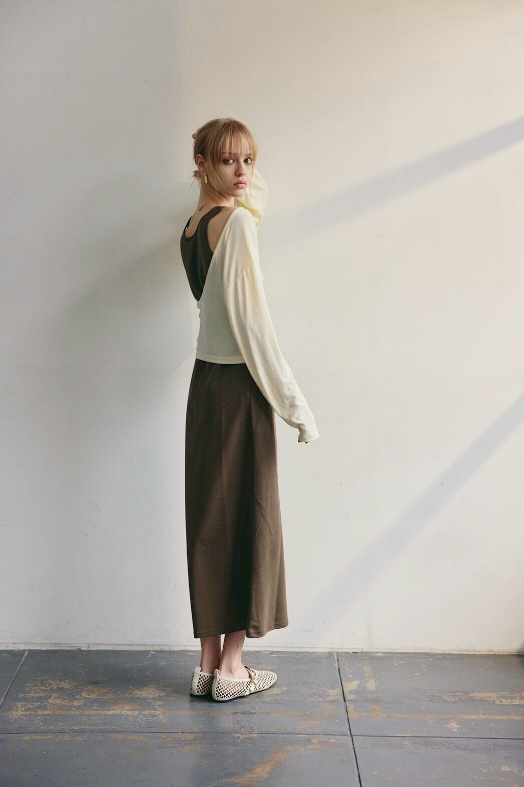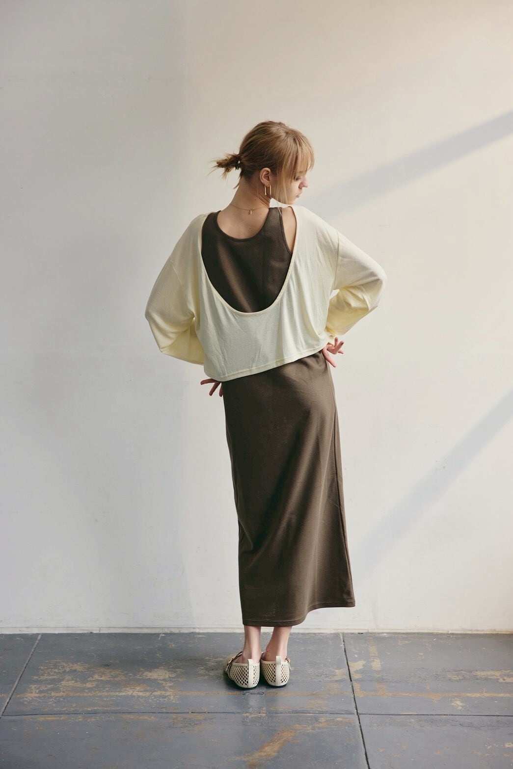 バックに大胆な開きを入れたトップスと、アメスリデザインのワンピースをセットに。