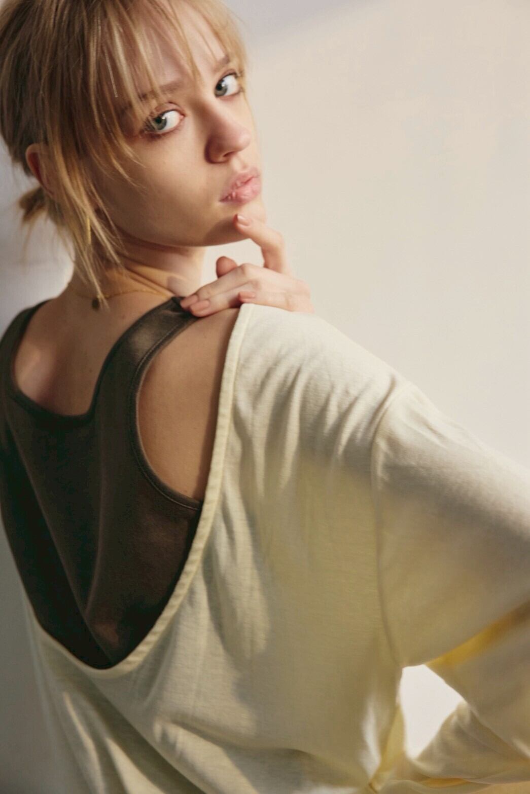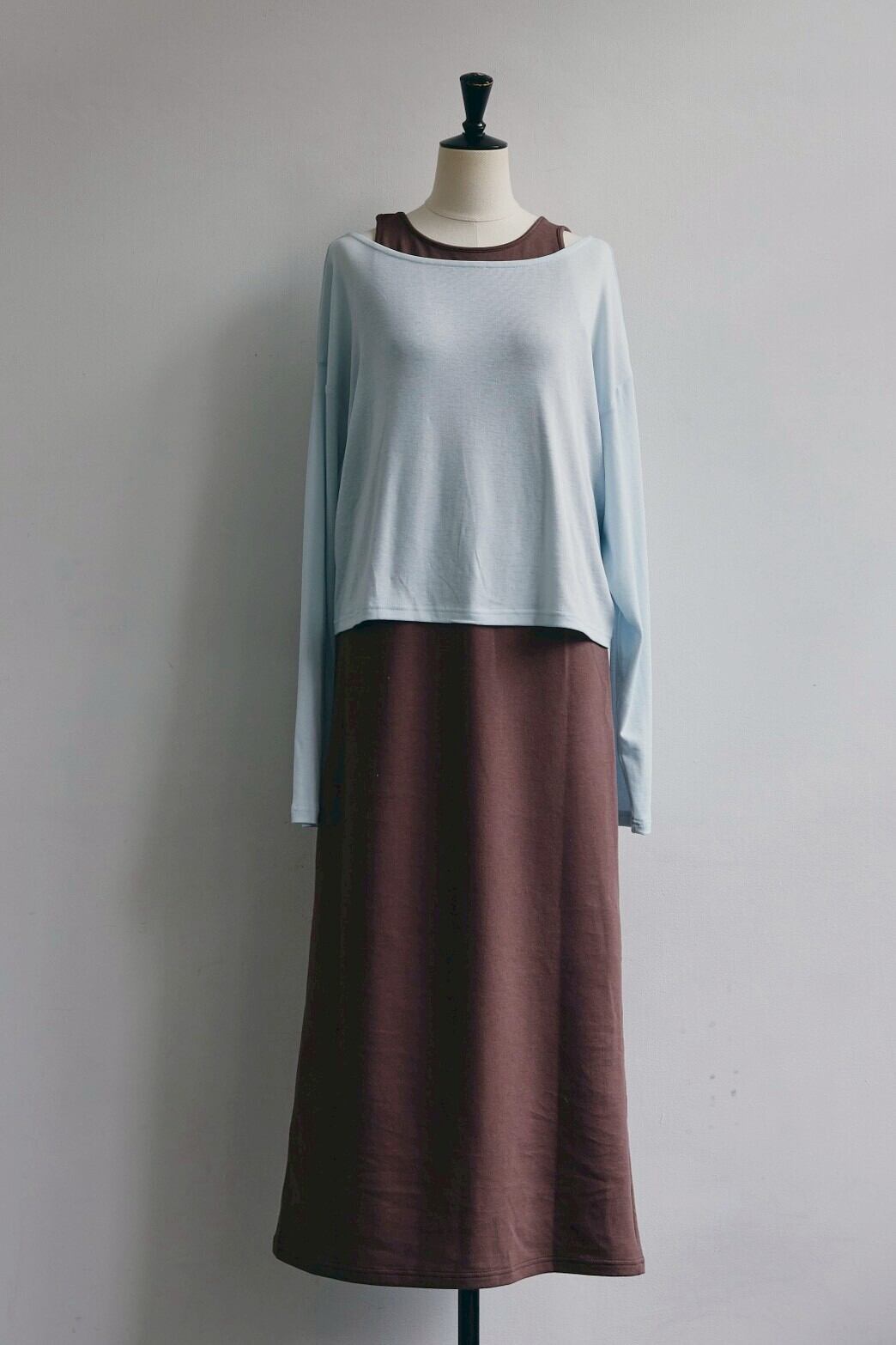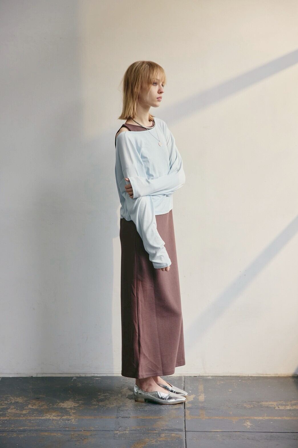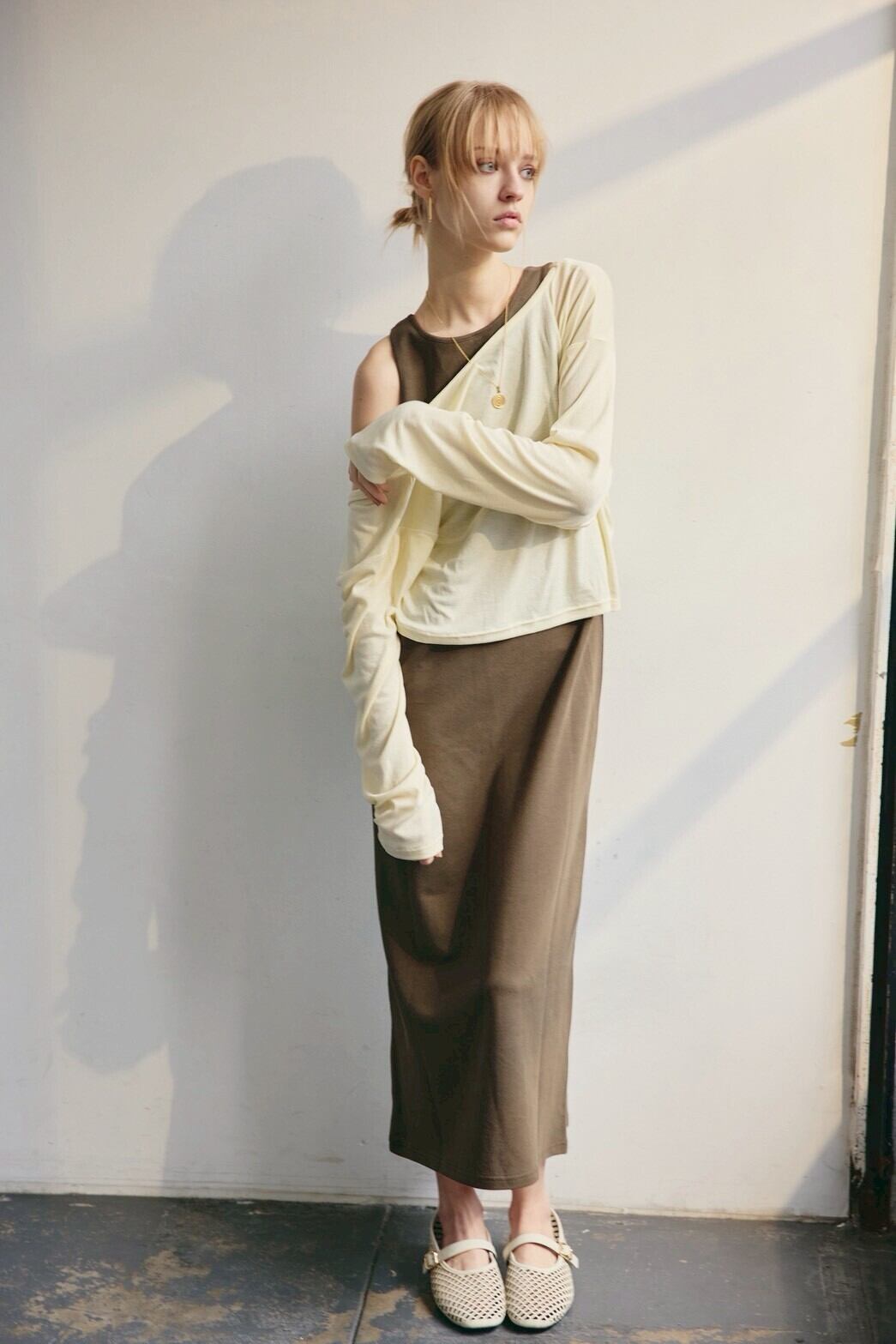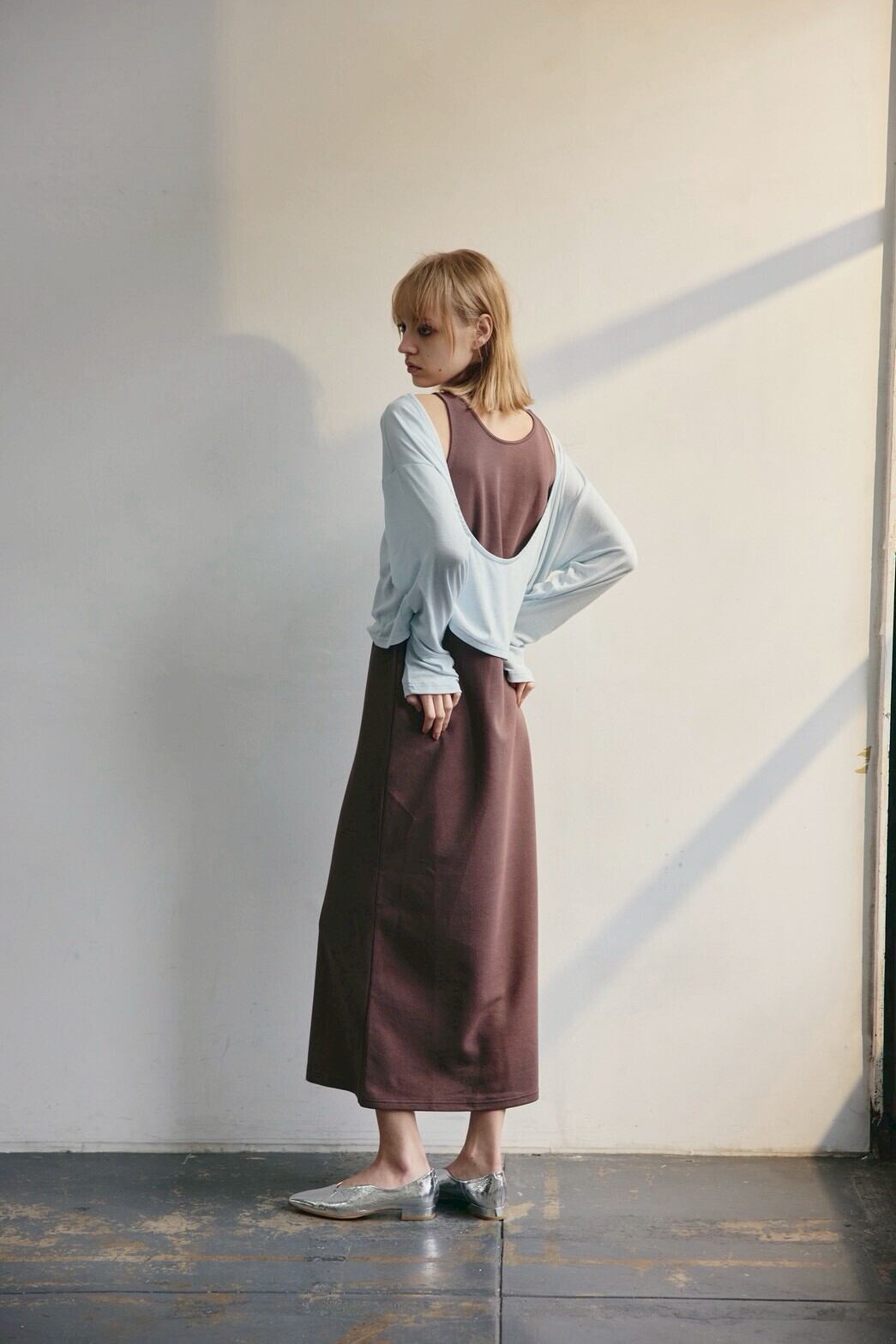 バックに大胆な開きを入れたトップスと、アメスリデザインのワンピースをセットに。